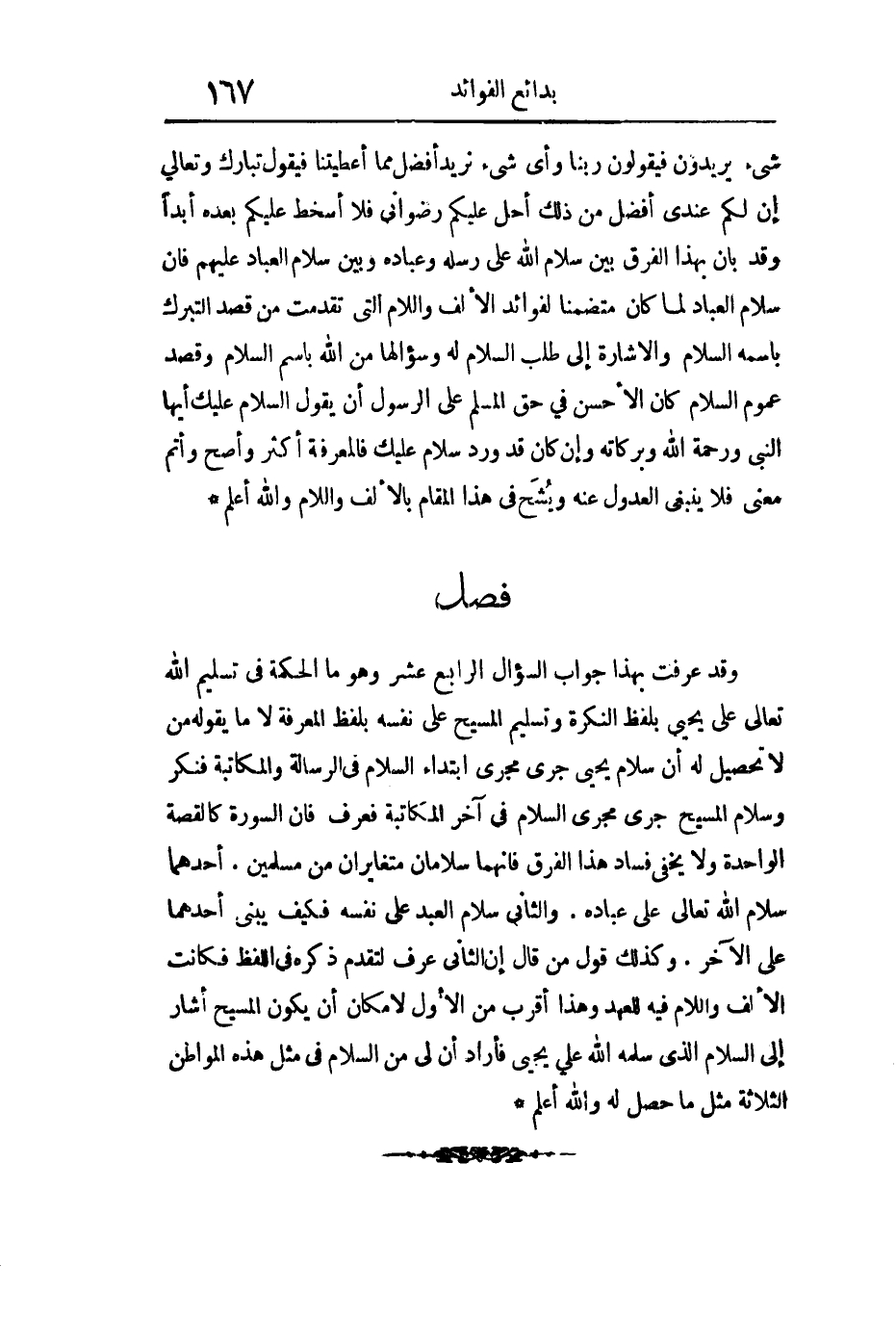 شيء يريدون فيقولون ربنا وأي شيء نريد أفضل مما أعطيتنا فيقول تبارك وتعالى: "إن لكم عندي أفضل من ذلك أحل عليكم رضواني فلا أسخط عليكم بعده أبدا" وقد بان بهذا الفرق بين سلام الله على رسله وعباده وبين سلام العباد عليهم فإن سلام العباد لما كان متضمنا لفوائد الألف واللام التي تقدمت من قصد التبرك باسمه السلام والإشارة إلى طلب السلام له وسؤالها من الله باسم السلام وقصد عموم السلام كان الأحسن في حق المسلم على الرسول أن يقول السلام عليك أيها النبي ورحمة الله وبركاته وإن كان قد ورد سلام عليك فالمعرفة أكثر وأصح وأتم معنى فلا ينبغي العدول عنه ويشح في هذا المقام بالألف واللام والله أعلم.
