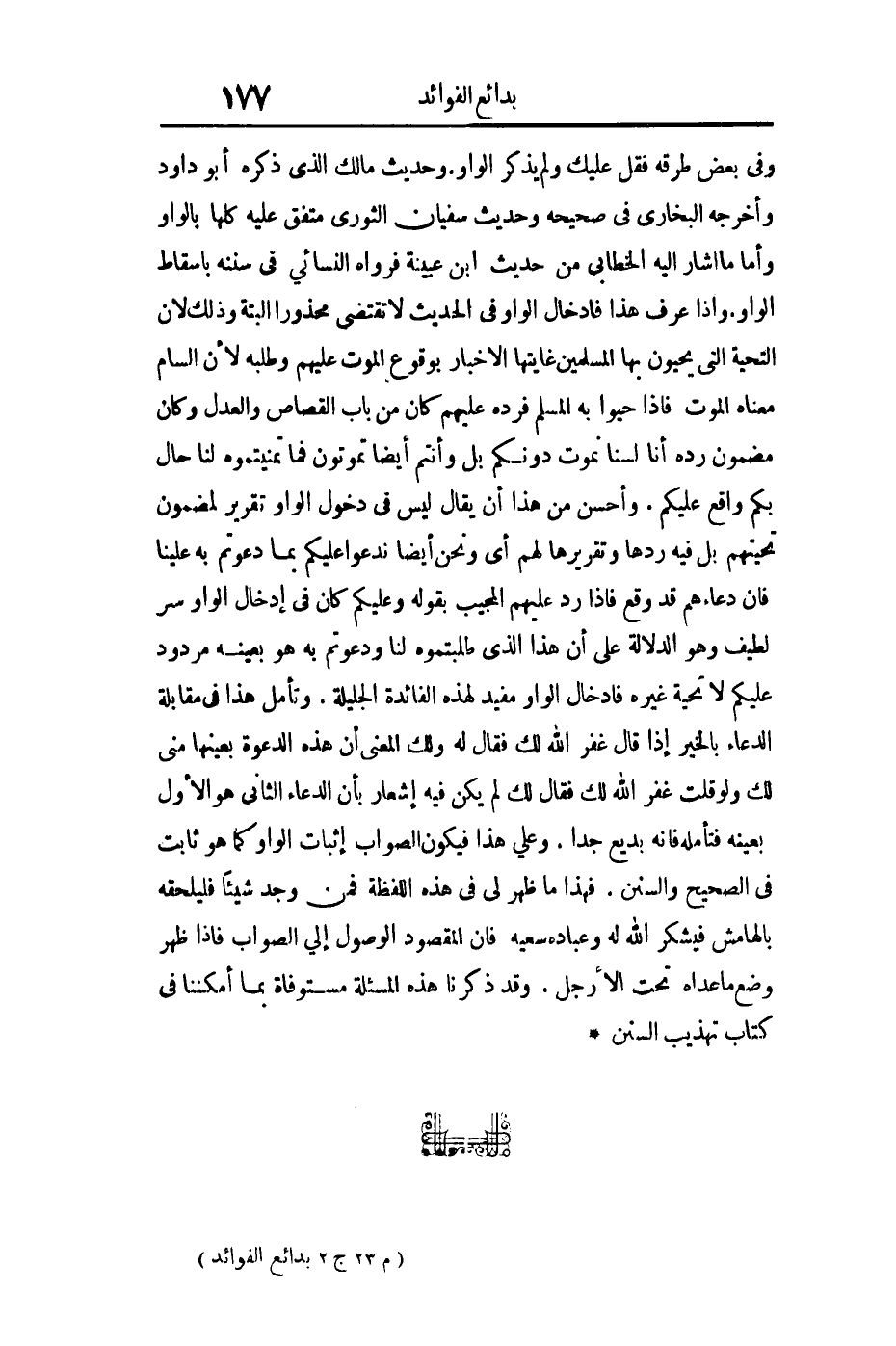 وفي بعض طرقه فقل: عليك ولم يذكر الواو وحديث مالك الذي ذكره أبو داود وأخرجه البخاري في صحيحه وحديث سفيان الثوري متفق عليه كلها بالواو وأما ما أشار إليه الخطابي من حديث ابن عيينة فرواه النسائي في سننه بإسقاط الواو وإذا عرف هذا فإدخال الواو في الحديث لا تقتضي محذورا البتة وذلك لأن التحية التي يحيون بها المسلمين غايتها الإخبار بوقوع الموت عليهم وطلبه لأن السام معناه الموت فإذا حيوا به المسلم فرده عليهم كان من باب القصاص والعدل وكان مضمون رده أنا لسنا نموت دونكم بل وأنتم أيضا تموتون فما تمنيتموه لنا حال بكم واقع عليكم وأحسن من هذا أن يقال ليس في دخول الواو تقرير لمضمون تحيتهم بل فيه ردها وتقريرها لهم أي ونحن أيضا ندعو عليكم بما دعوتم به علينا فإن دعاءهم قد وقع فإذا رد عليهم المجيب بقوله وعليكم كان في إدخال الواو سر لطيف وهو الدلالة على أن هذا الذي طلبتموه لنا ودعوتم به هو بعينه مردود عليكم لا تحية غيره فإدخال الواو مفيد لهذه الفائدة الجليلة وتأمل هذا في مقابلة الدعاء بالخير إذا قال غفر الله لك فقال له ولك المعنى أن هذه الدعوة بعينها مني لك ولو قلت غفر الله لك فقال لك لم يكن فيه إشعار بأن الدعاء الثاني هو الأول بعينه فتأمله فإنه بديع جدا وعلى هذا فيكون الصواب إثبات الواو كما هو ثابت في الصحيح والسنن فهذا ما ظهر لي في هذه اللفظة فمن وجد شيئا فليلحقه بالهامش فيشكر الله له وعباده سعيه فإن المقصود الوصول إلى الصواب فإذا ظهر وضع ما عداه تحت الأرجل وقد ذكرنا هذه المسألة مستوفاة بما أمكننا في كتاب تهذيب السنن.