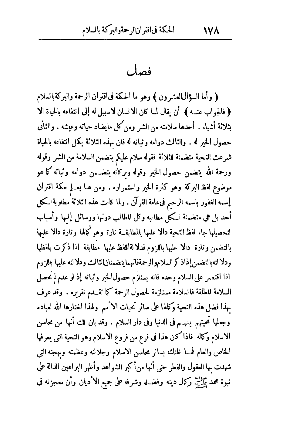 وأما السؤال العشرون: وهو ما الحكمة في اقتران الرحمة والبركة بالسلام فالجواب عنه: أن يقال لما كان الإنسان لا سبيل له إلى انتفاعه بالحياة إلا بثلاثة أشياء أحدها سلامته من الشر ومن كل ما يضاد حياته وعيشه والثاني حصول الخير له والثالث دوامه وثباته له فإن بهذه الثلاثة يكمل انتفاعه بالحياة لقد شرعت التحية متضمنة للثلاثة فقوله: {سَلامٌ عَلَيْكُمْ} يتضمن السلامة من الشر وقوله ورحمة الله يتضمن حصول الخير وقوله وبركاته يتضمن دوامه وثباته كما هو موضوع لفظ البركة وهو كثرة الخير واستمراره ومن هنا يعلم حكمة اقتران اسمه الغفور باسمه الرحيم في عامة القرآن ولما كانت هذه الثلاثة مطلوبة لكل أحد بل هي متضمنة لكل مطالبه وكل المطالب دونها ووسائل إليها وأسباب لتحصيلها جاء لفظ التحية دالا عليها بالمطابقة تارة وهو كمالها وتارة دالا عليها بالتضمن وتارة دالا عليها باللزوم فدلالة اللفظ عليها مطابقة إذا ذكرت بلفظها ودلالته بالتضمن إذا ذكر السلام والرحمة فإنهما يتضمنان الثالث ودلالته عليها باللزوم إذا اقتصر على السلام وحده فإنه يستلزم حصول الخير وثباته إذ لو عدم لم تحصل السلامة المطلقة فالسلامة مستلزمة لحصول الرحمة كما تقدم تقريره قد عرف بهذا فضل هذه التحية وكمالها على سائر تحيات الأمم ولهذا اختارها الله لعباده وجعلها تحيتهم بينهم في الدنيا وفي دار السلام وقد بان لك أنها من محاسن الإسلام وكماله فإذا كان هذا في فرع من فروع الإسلام وهو التحية التي يعرفها الخاص والعام فما ظنك بسائر محاسن الإسلام وجلالته وعظمته وبهجته التي شهدت بها العقول والفطر حتى أنها من أكبر الشواهد وأظهر البراهين الدالة على نبوة محمد صلى الله عليه وسلم وكمال دينه وفضله وشرفه على جميع الأديان وأن معزته في
