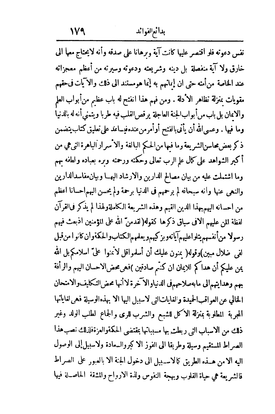 نفس دعوته فلو اقتصر عليها كانت آية وبرهانا على صدقه وأنه لا يحتاج معها إلى خارق ولا آية منفصلة بل دينه وشريعته ودعوته وسيرته من أعظم معجزاته عند الخاصة من أمته حتى أن إيمانهم به إنما هو مستند إلى ذلك والآيات في حقهم مقويات بمنزلة تظاهر الأدلة ومن فهم هذا انفتح له باب عظيم من أبواب العلم والإيمان بل باب من أبواب الجنة العاجلة يرقص القلب فيه طربا ويتمنى أنه له بالدنيا وما فيها وعسى الله أن يأتي بالفتح أو أمر من عنده فيساعد على تعليق كتاب يتضمن ذكر بعض محاسن الشريعة وما فيها من الحكم البالغة والأسرار الباهرة التي هي من أكبر الشواهد على كمال علم الرب تعالى وحكمته ورحمته وبره بعباده ولطفه بهم وما اشتملت عليه من بيان مصالح الدارين والإرشاد إليها وبيان مفاسد الدارين والنهي عنها وأنه سبحانه لم يرحمهم في الدنيا برحمة ولم يحسن إليهم إحسانا أعظم من إحسانه إليهم بهذا الدين القيم وهذه الشريعة الكاملة ولهذا لم يذكر في القرآن لفظة المن عليهم إلا في سياق ذكرها كقوله: {لَقَدْ مَنَّ اللَّهُ عَلَى الْمُؤْمِنِينَ إِذْ بَعَثَ فِيهِمْ رَسُولاً مِنْ أَنْفُسِهِمْ يَتْلُو عَلَيْهِمْ آيَاتِهِ وَيُزَكِّيهِمْ وَيُعَلِّمُهُمُ الْكِتَابَ وَالْحِكْمَةَ وَإِنْ كَانُوا مِنْ قَبْلُ لَفِي ضَلالٍ مُبِينٍ} وقوله: {يَمُنُّونَ عَلَيْكَ أَنْ أَسْلَمُوا قُلْ لا تَمُنُّوا عَلَيَّ إِسْلامَكُمْ بَلِ اللَّهُ يَمُنُّ عَلَيْكُمْ أَنْ هَدَاكُمْ لِلإِيمَانِ إِنْ كُنْتُمْ صَادِقِينَ} فهي محض الإحسان إليهم والرأفة بهم وهدايتهم إلى ما به صلاحهم في الدنيا والآخرة لا أنها محض التكليف والامتحان الخالي عن العواقب الحميدة والغايات التي لا سبيل إليها إلا بهذه الوسيلة فهي لغاياتها المجربة المطلوبة بمنزلة الأكل للشبع والشرب للري والجماع لطلب الولد وغير ذلك من الأسباب التي ربطت بها مسبباتها بمقتضى الحكمة والعزة فلذلك نصب هذا الصراط المستقيم وسيلة وطريقا إلى الفوز الأكبر والسعادة ولا سبيل إلى الوصول إليه إلا من هذه الطريق كما لا سبيل إلى دخول الجنة إلا بالعبور على الصراط فالشريعة هي حياة القلوب وبهجة النفوس ولذة الأرواح والمشقة الحاصلة فيها