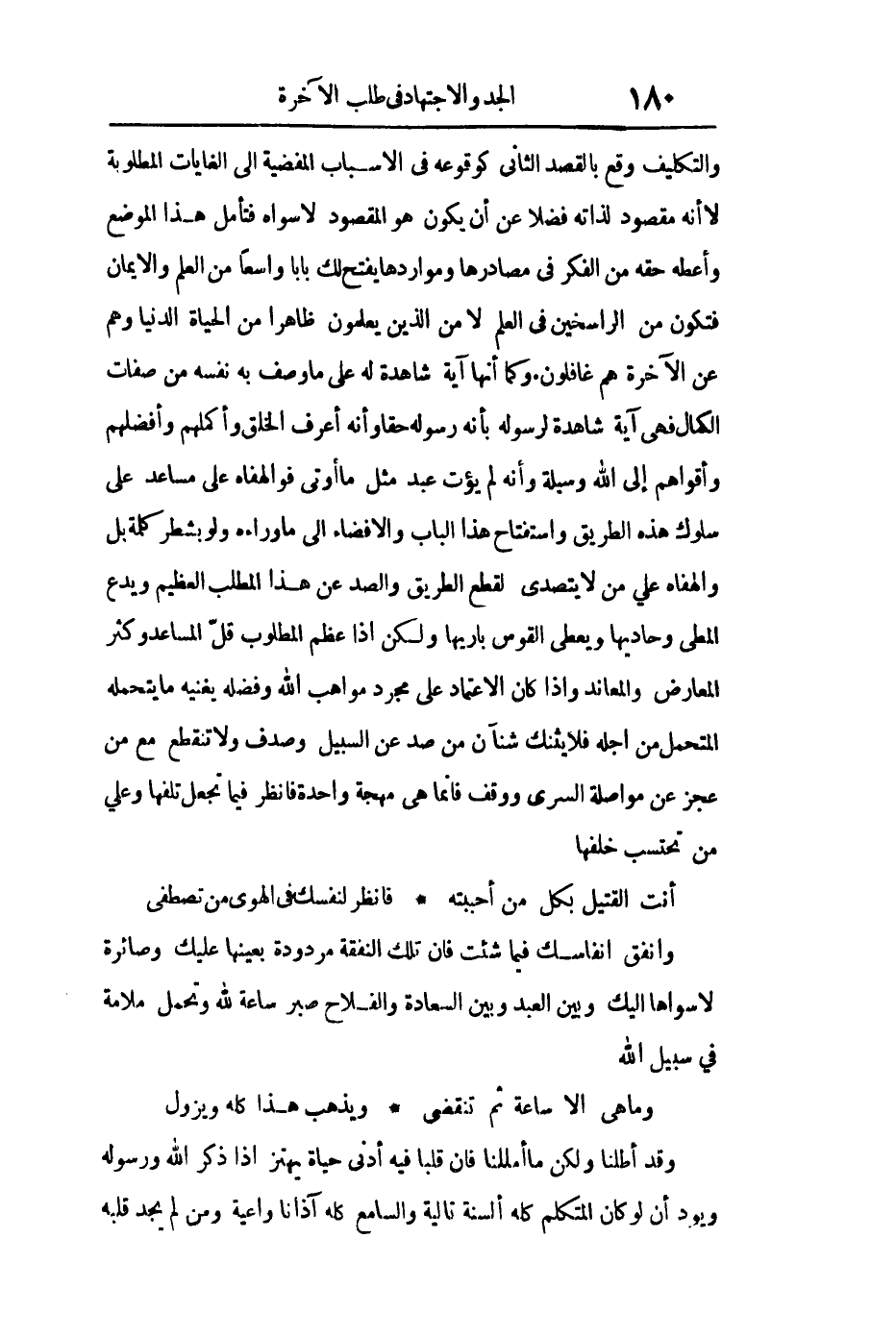 والتكليف وقع بالقصد الثاني كوقوعه في الأسباب المفضية إلى الغايات المطلوبة لا أنه مقصود لذاته فضلا عن أن يكون هو المقصود لا سواه فتأمل هذا الموضع وأعطه حقه من الفكر في مصادرها ومواردها يفتح لك بابا واسعا من العلم والإيمان فتكون من الراسخين في العلم لا من الذين يعلمون ظاهرا من الحياة الدنيا وهم عن الآخرة هم غافلون وكما أنها آية شاهدة له على ما وصف به نفسه من صفات الكمال فهي آية شاهدة لرسوله بأنه رسول حقا وأنه أعرف الخلق وأكملهم وأفضلهم وأقواهم إلى الله وسيلة وأنه لم يؤت عبد مثل ما أوتي فوالهفاه على مساعد على سلوك هذا الطريق واستفتاح هذا الباب والإفضاء إلى ما وراءه ولو بشطر كلمة بل فوالهفاه على من لا يتصدى لقطع الطريق والصد عن هذا المطلب العظيم ويدع المطي وحاديها ويعطي القوس باريها ولكن إذا عظم المطلوب قل المساعد وكثر المعارض والمعاند وإذا كان الاعتماد على مجرد مواهب الله وفضله يغنيه ما يتحمله المتحمل من أجله فلا يثنك شنآن من صد عن السبيل وصدق ولا تنقطع مع من عجز عن مواصلة السري ووقف فإنما هي مهجة واحدة فانظر فيما تجعل تلفها وعلى من تحتسب خلفها.