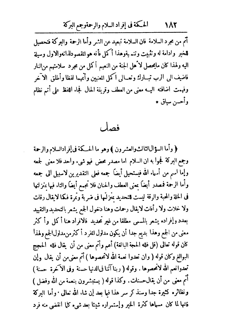 وأما السؤال الثالث والعشرين: وهو ما الحكمة في إفراد السلام والرحمة وجمع البركة فجوابه: أن السلام إما مصدر محض فهو شيء واحد فلا معنى لجمعه وإما اسم من أسماء الله تعالى فيستحيل أيضا جمعه فعلى التقديرين لا سبيل إلى جمعه وأما الرحمة فمصدر أيضا بمعنى العطف والحنان فلا تجمع أيضا والتاء فيها بمنزلتها في الخلة والمحبة والرقة ليست للتحديد بمنزلتها في ضربة وتمرة فكما لا يقال رقات ولا خلات ولا رأفات لا يقال رحمات وهنا دخول الجمع يشعر بالتحديد والتقييد بعدد وإفراده يشعر بالمسمى مطلقا من غير تحديد فالإفراد هنا أكمل وأكثر معنى من الجمع وهذا بديع جدا أن يكون مدلول المفرد أكثر من مدلول الجمع ولهذا كان قوله تعالى: {قُلْ فَلِلَّهِ الْحُجَّةُ الْبَالِغَةُ} أعم وأتم معنى من أن يقال: فلله الحجج البوالغ وكان قوله: {وَإِنْ تَعُدُّوا نِعْمَةَ اللَّهِ لا تُحْصُوهَا} أتم معنى من أن يقال: وإن تعدوا نعم الله لا تحصوها وقوله: {رَبَّنَا آتِنَا فِي الدُّنْيَا حَسَنَةً وَفِي الآخِرَةِ حَسَنَةً} أتم معنى من أن يقال حسنات وكذا قوله: {يَسْتَبْشِرُونَ بِنِعْمَةٍ مِنَ اللَّهِ وَفَضْلٍ} ونظائره كثيرة جدا وسنذكر سر هذا فيما بعد إن شاء الله تعالى وأما البركة فإنا لما كان مسماها كثرة الخير واستمراره شيئا بعد شيء كلما انقضى منه فرد