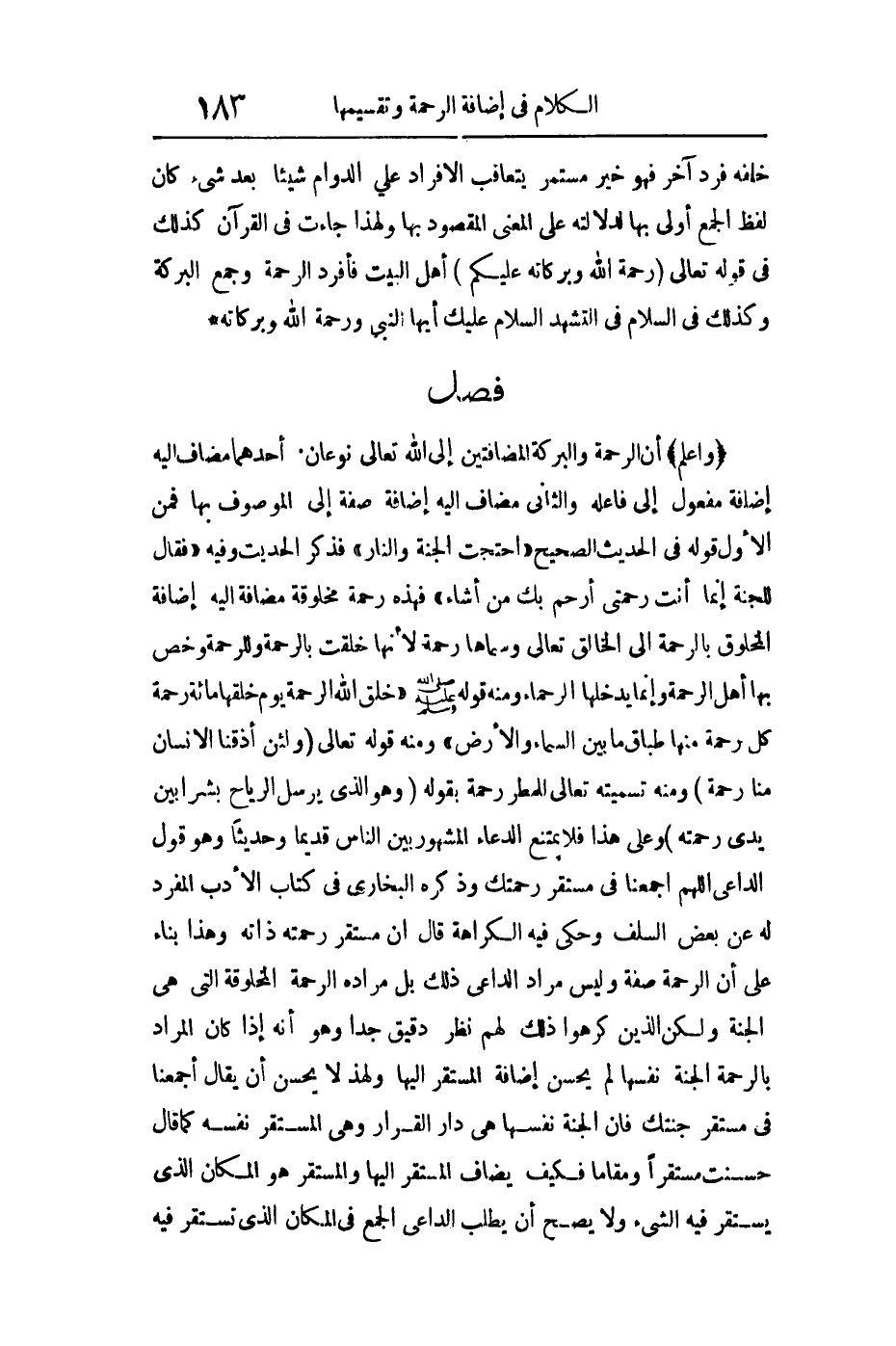 واعلم: أن الرحمة المضافة إلى الله تعالى نوعان أحدهما: مضاف إليه إضافة مفعول إلى فاعله والثاني: مضاف إليه إضافة صفة إلى الموصوف بها فمن الأول قوله في الحديث الصحيح: "احتجت الجنة والنار " فذكر الحديث وفيه "فقال: للجنة إنما أنت رحمتي أرحم بك من أشاء " رواه مسلم وأحمد فهذه رحمة مخلوقة مضافة إليه إضافة المخلوق بالرحمة إلى الخالق تعالى وسماها رحمة لأنها خلقت بالرحمة وللرحمة وخص بها أهل الرحمة وإنما يدخلها الرحماء ومنه قوله صلى الله عليه وسلم: " خلق الله الرحمة يوم خلقها مائة رحمة كل رحمة منها طباق ما بين السماء والأرض " رواه مسلم والحاكم وروى البخاري نحوه ومنه قوله تعالى: {وَلَئِنْ أَذَقْنَا الأِنْسَانَ مِنَّا رَحْمَةً} ومنه تسميته تعالى للمطر رحمة بقوله: {وَهُوَ الَّذِي يُرْسِلُ الرِّيَاحَ بُشْراً بَيْنَ يَدَيْ رَحْمَتِهِ} وعلى هذا فلا يمتنع الدعاء المشهور بين الناس قديما وحديثا وهو قول الداعي: "اللهم اجمعنا في مستقر رحمتك وذكره البخاري في كتاب الأدب المفرد له عن بعض السلف" وحكى فيه الكراهة قال: "إن مستقر رحمته ذاته" وهذا بناء على أن الرحمة صفة وليس مراد الداعي ذلك بل مراده الرحمة المخلوقة التي هي الجنة ولكن الذين كرهوا ذلك لهم نظر دقيق جدا وهو أنه إذا كان المراد بالرحمة الجنة نفسها لم يحسن إضافة المستقر إليها ولهذا لا يحسن أن يقال اجمعنا في مستقر جنتك فإن الجنة نفسها هي دار القرار وهي المستقر نفسه كما قال حسنت مستقرا ومقاما فكيف يضاف المستقر إليها والمستقر هو المكان الذي يستقر فيه الشيء ولا يصح أن يطلب الداعي الجمع في المكان الذي تستقر فيه