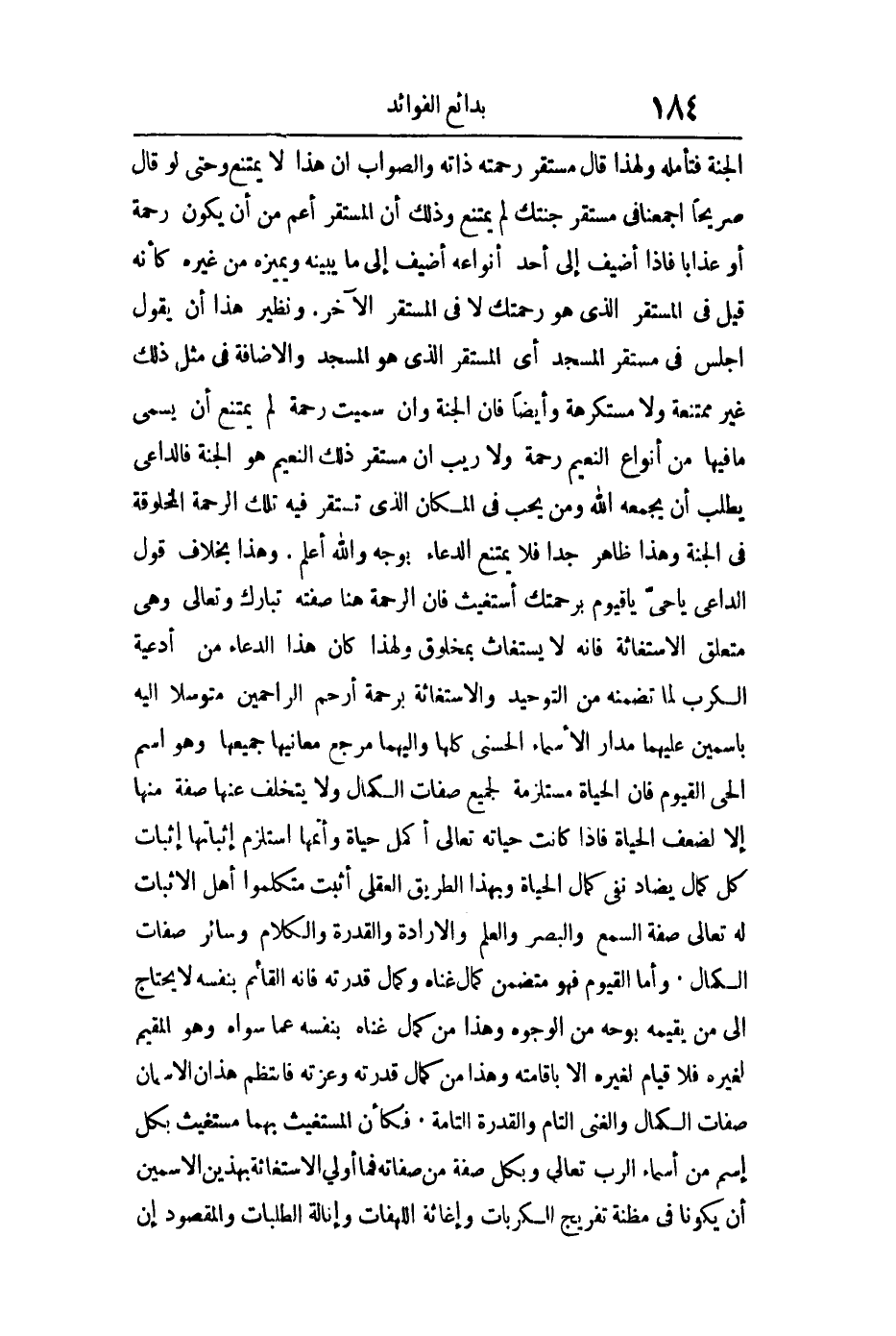 الجنة فتأمله ولهذا قال: "مستقر رحمته ذاته" والصواب: أن هذا لا يمتنع حتى ولو قال صريحا اجمعنا في مستقر جنتك لم يمتنع وذلك أن المستقر أعم من أن يكون رحمة أو عذابا فإذا أضيف إلى أحد أنواعه أضيف إلى ما يبينه ويميزه من غيره كأنه قيل في المستقر الذي هو رحمتك لا في المستقر الآخر ونظير هذا أن يقال اجلس في مستقر المسجد أي المستقر الذي هو المسجد والإضافة في مثل ذلك غير ممتنعة ولا مستكرهة وأيضا فإن الجنة وإن سميت رحمة لم يمتنع أن يسمى ما فيها من أنواع النعيم رحمة ولا ريب أن مستقر ذلك النعيم هو الجنة فالداعي يطلب أن يجمعه الله ومن يحب في المكان الذي تستقر فيه تلك الرحمة المخلوقة في الجنة وهذا ظاهر جدا فلا يمتنع الدعاء بوجه والله أعلم وهذا بخلاف قول الداعي يا حي يا قيوم برحمتك أستغيث فإن الرحمة هنا