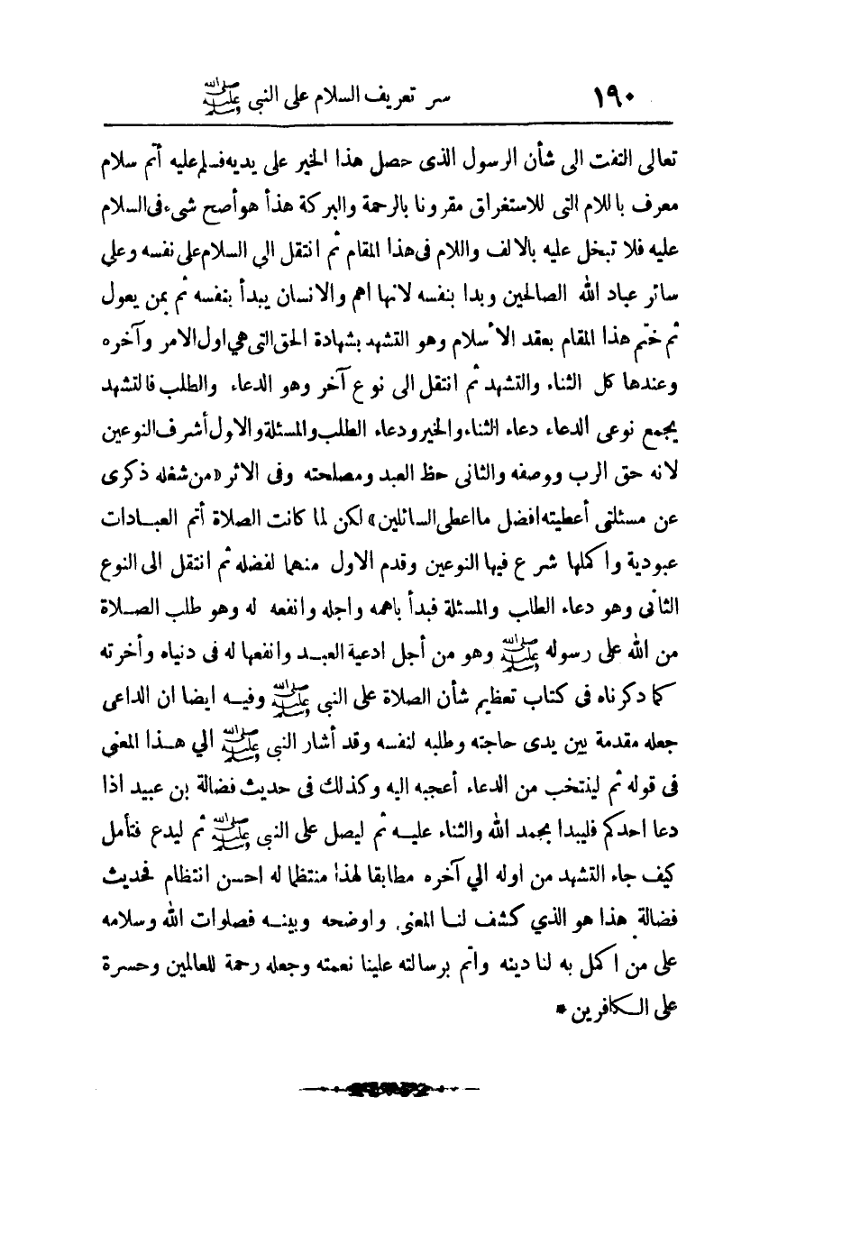 لكن لما كانت الصلاة أتم العبادات عبودية وأكملها شرع فيه النوعين وقدم الأول منهما لفضله ثم انتقل إلى النوع الثاني وهو دعاء الطلب والمسألة فبدأ بأهمه وأجله وأنفعه له وهو طلب الصلاة من الله تعالى على رسوله صلى الله عليه وسلم وهو من أجل أدعية العبد وأنفعها له في دنياه وآخرته كما ذكرناه في كتاب تعظيم شأن الصلاة على النبي وفيه أيضا أن الداعي جعله مقدمة بين يدي حاجته وطلبه لنفسه وقد أشار إلى النبي صلى الله عليه وسلم إلى هذا المعنى في قوله ثم لينتخب من الدعاء أعجبه إليه وكذلك في حديث فضالة بن عبيد إذا دعا أحدكم فليبدأ بحمد الله والثناء عليه ثم ليصل على النبي صلى الله عليه وسلم ثم ليدع فتأمل كيف جاء التشهد من أوله إلى آخره مطابقا لهذا منتظما له أحسن انتظام فحديث فضالة هذا هو الذي كشف لنا المعنى وأوضحه وبينه فصلوات الله وسلامه على من أكمل به لنا دينه وأتم برسالته علينا نعمته وجعله رحمة للعالمين وحسرة على الكافرين.