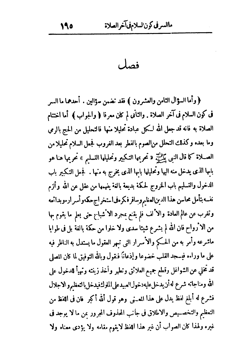 أما السؤال الثامن والعشرون: فقد يتضمن ذلك سؤالين أحدهما: ما السر في كون السلام في آخر الصلاة والثاني: لم كان معرفا والجواب: أما اختتام الصلاة به فقد جعل الله تعالى لكل عبادة تحليلا منها فالتحليل من الحج بالرمي وما بعده وكذلك التحليل من الصوم بالفطر بعد الغروب فجعل السلام تحليلا من الصلاة كما قال النبي صلى الله عليه وسلم "تحريمها التكبير وتحليلها التسليم " صحيح تحريمها هنا هو بابها الذي يدخل منه إليها وتحليلها بابها الذي يخرج به منها فجعل التكبير باب الدخول والتسليم باب الخروج لحكمة بديعة بالغة يفهمها من عقل عن الله وألزم نفسه بتأمل محاسن هذا الدين العظيم وسافر فكره في استخراج حكمه وأسراره وبدائعه وتغرب عن عالم العادة والألف فلم يقنع بمجرد الأشباح حتى يعلم ما يقوم به من الأرواح فإن الله تعالى لم يشرع شيئا سدى ولا خلوا من حكمة بالغة بل في طوايا ما شرعه وأمر به من الحكم والأسرار التي تبهر العقول ما يستدل به الناظر فيه على وراءه فيسجد القلب خضوعا وإذعانا فنقول وبالله التوفيق لما كان المصلي قد تخلى عن الشواغل وقطع جميع العلائق وتطهر وأخذ زينته وتهيأ للدخول على الله تعالى ومناجاته شرع له أن يدخل عليه دخول العبيد على الملوك فيدخل بالتعظيم والإجلال فشرع له أبلغ لفظ يدل على هذا المعنى وهو قول الله أكبر فإن في اللفظ من التعظيم والتخصيص والإطلاق في جانب المحذوف المجرور بمن ما لا يوجد في غيره ولهذا كان الصواب أن غير هذا اللفظ لا يقوم مقامه ولا يؤدي معناه ولا