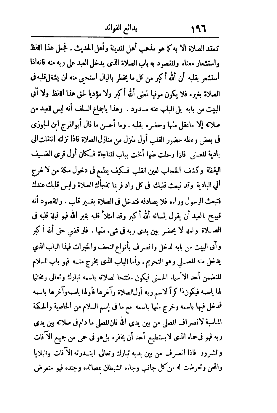 تنعقد الصلاة إلا به كما هو مذهب أهل المدينة وأهل الحديث فجعل هذا اللفظ واستشعار معناه والمقصود باب الصلاة الذي يدخل العبد على ربه منه فإنه إذا استشعر بقلبه أن الله أكبر من كل ما يخطر بالبال استحيا منه أن يشغل قلبه في الصلاة بغيره فلا يكون موفيا لمعنى الله أكبر ولا مؤديا لحق هذا اللفظ ولا أتى البيت من بابه بل الباب عنه مسدود وهذا بإجماع السلف أنه ليس للعبد من صلاته إلا ما عقل منها وحضره بقلبه وما أحسن ما قال أبو الفرج بن الجوزي في بعض وعظه: حضور القلب أول منزل من منازل الصلاة فإذا نزلته انتقلت إلى بادية المعنى فإذا رحلت عنها أنخت بباب المناجاة فكان أول قرى الضيف اليقظة وكشف الحجاب لعين القلب فكيف يطمع في دخول مكة من لا خرج إلى البادية وقد تبعث قلبك في كل واد فربما تفجأك الصلاة وليس قلبك عندك فتبعث الرسول وراءه فلا يصادفه فتدخل في الصلاة بغير قلب والمقصود أنه قبيح بالعبد أن يقول بلسانه الله أكبر وقد امتلأ قلبه بغير الله فهو قبلة قلبه في الصلاة ولعله لا يحضر بين يدي ربه في شيء منها فلو قضى حق الله أكبر وأتى البيت من بابه لدخل وانصرف بأنواع التحف والخيرات فهذا الباب الذي يدخل منه المصلى وهو التحريم وأما الباب الذي يخرج منه فهو باب السلام المتضمن أحد الأسماءا الحسنى فيكون مفتتحا لصلاته باسمه تبارك وتعالى ومختتما لها باسمه فيكون ذاكرا لاسم ربه أول الصلاة وآخرها فأولها باسمه وآخرها باسمه فدخل فيها باسمه وخرج منها باسمه مع ما في اسم السلام من الخاصية والحكمة المناسبة لانصراف المصلي من بين يدي الله تعالى فإن المصلي ما دام في صلاته بين يدي ربه فهو في حماه الذي لا يستطيع أحد أن يخفره بل هو في حمى من جميع الآفات والشرور فإذا انصرف من بين يديه تبارك وتعالى ابتدرته الآفات والبلايا والمحن وتعرضت له من كل جانب وجاءه الشيطان بمصائده وجنده فهو متعرض