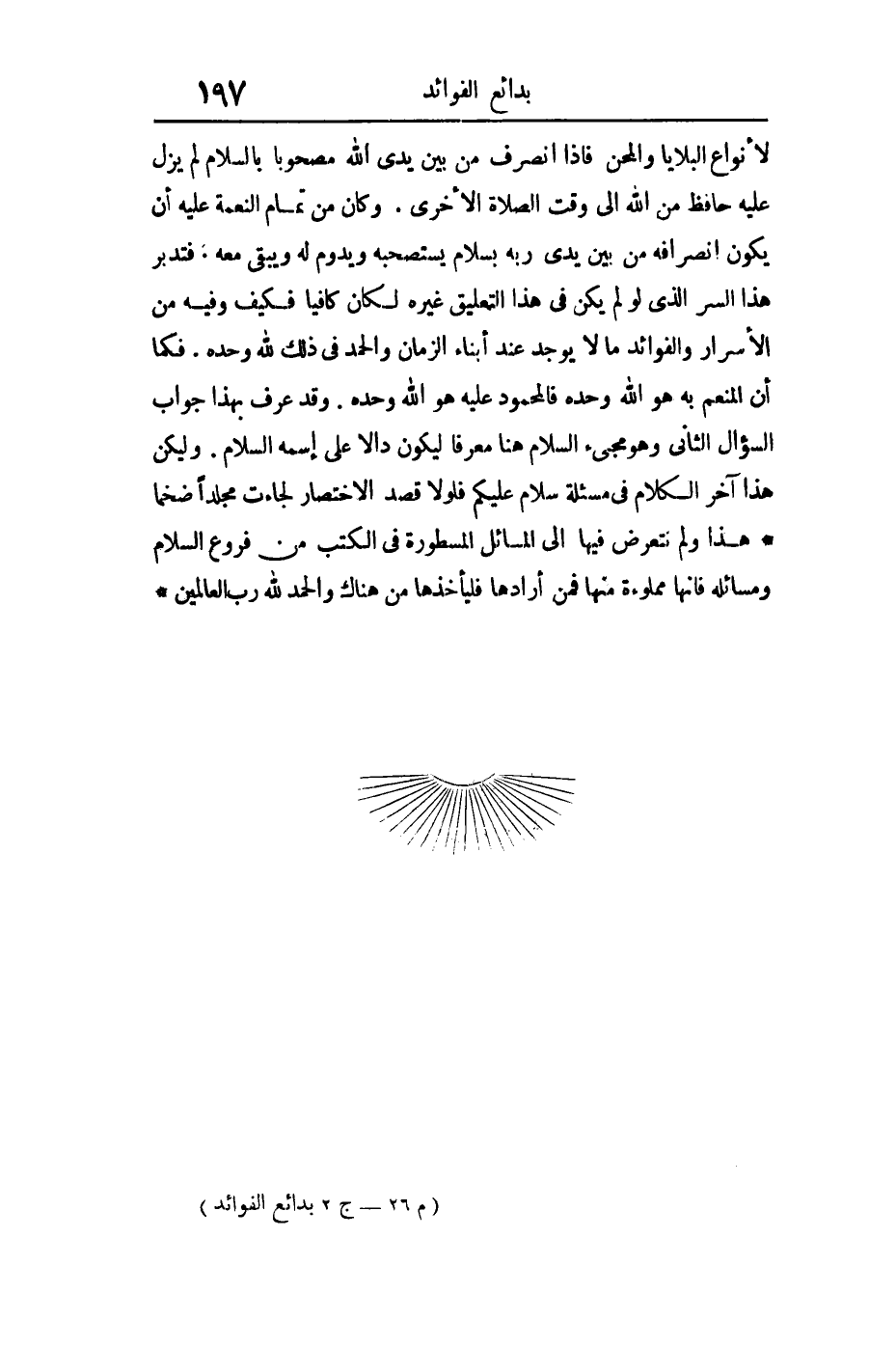 لأنواع البلايا والمحن فإذا انصرف من بين يدي الله مصحوبا بالسلام لم يزل عليه حافظ من الله إلى وقت الصلاة الأخرى وكان من تمام النعمة عليه أن يكون انصرافه من بين يدي ربه بسلام يستصحبه ويدوم له ويبقى معه فتدبر هذا السر الذي لو لم يكن في هذا التعليق غيره لكان كافيا فكيف وفيه من الأسرار والفوائد ما لا يوجد عند أبناء الزمان والحمد في ذلك لله وحده فكما أن المنعم به هو الله وحده فالمحمود عليه هو الله وحده وقد عرف بهذا جواب السؤال الثاني وهو مجيء السلام هنا معرفا ليكون دالا على اسمه السلام وليكن هذا آخر الكلام في مسألة سلام عليكم فلولا قصد الاختصار لجاءت مجلدا ضخما هذا ولم تتعرض فيها إلى المسائل المسطورة في الكتب من فروع السلام ومسائله فإنها مملوءة منها فمن أرادها فليأخذها من هناك والحمد لله رب العالمين.