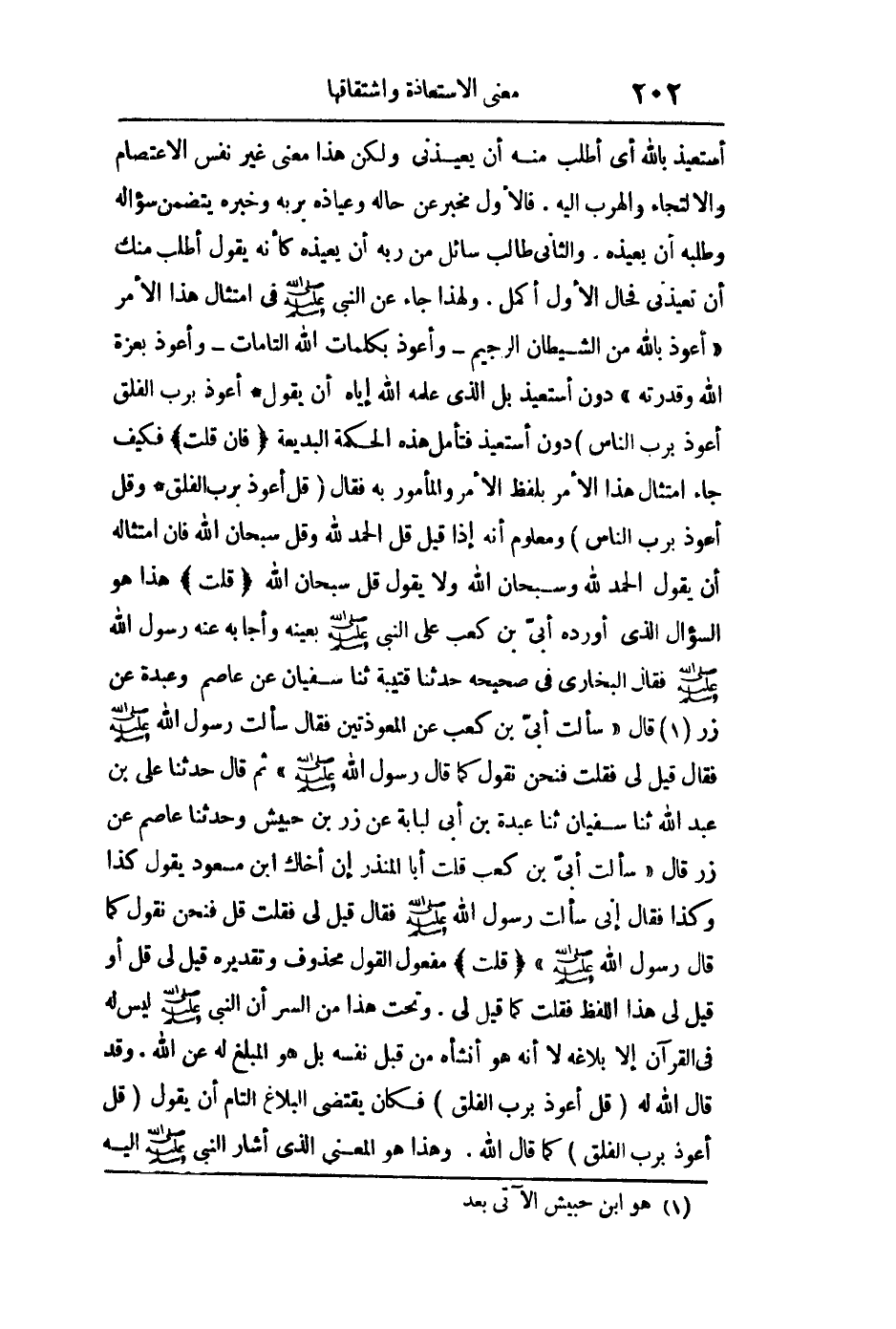 أستعيذ بالله تعالى أي أطلب منه أن يعيذني ولكن هذا معنى غير نفس الاعتصام والالتجاء والهرب إليه فالأول: يخبر عن حاله وعياذه بربه وخبره يتضمن سؤاله وطلبه أن يعيذه والثاني: طالب سائل من ربه أن يعيذه كأنه يقول أطلب منك أن تعيذني فحال الأول أكمل مجيء امتثال هذا الأمر بلفظ الأمر ولهذا جاء عن النبي صلى الله عليه وسلم في امتثال هذا الأمر: "أعوذ بالله من الشيطان الرجيم وأعوذ بكلمات الله التامات وأعوذ بعزة الله وقدرته " دون أستعيذ بل الذي علمه الله إياه أن يقول {أَعُوذُ بِرَبِّ الْفَلَقِ} {أَعُوذُ بِرَبِّ النَّاسِ} دون أستعيذ فتأمل هذه الحكمة البديعة فإن قلت فكيف جاء امتثال هذا الأمر بلفظ الأمر والمأمور به فقال: {قُلْ أَعُوذُ بِرَبِّ الْفَلَقِ} و {قُلْ أَعُوذُ بِرَبِّ النَّاسِ} ومعلوم أنه إذا قيل: قل الحمد لله وقل سبحان الله فإن امتثاله أن يقول الحمد لله وسبحان الله ولا يقول قل سبحان الله قلت: هذا هو السؤال الذي أورده أبي بن كعب على النبي صلى الله عليه وسلم بعينه وأجابه عنه رسول الله صلى الله عليه وسلم فقال البخاري في صحيحه حدثنا قتيبة ثنا سفيان عن عاصم وعبده عن زر قال: "سألت أبي بن كعب عن المعوذتين فقال سألت رسول الله صلى الله عليه وسلم فقال قيل لي فقلت فنحن نقول كما قال رسول الله صلى الله عليه وسلم" رواه البخاري ثم قال حدثنا علي بن عبد الله ثنا سفيان ثنا عبدة بن أبي لبابة عن زر بن حبيش وحدثنا عاصم عن زر قال: "سألت أبي بن كعب قلت أبا المنذر إن أخاك ابن مسعود يقول كذا وكذا فقال: إني سألت رسول الله صلى الله عليه وسلم فقال قيل لي فقلت قل فنحن نقول كما قال رسول الله صلى الله عليه وسلم قلت: مفعول القول محذوف وتقديره قيل لي قل أو قيل لي هذا اللفظ فقلت كما قيل لي وتحت هذا السر أن النبي صلى الله عليه وسلم ليس له في القرآن إلا بلاغة لا أنه هو أنشأه من قبل نفسه بل هو المبلغ له عن الله وقد قال الله له: {قُلْ أَعُوذُ بِرَبِّ الْفَلَقِ} فكان يقتضي البلاغ التام أن يقول: {قُلْ أَعُوذُ بِرَبِّ الْفَلَقِ} كما قال الله وهذا هو المعنى الذي أشار النبي صلى الله عليه وسلم إليه