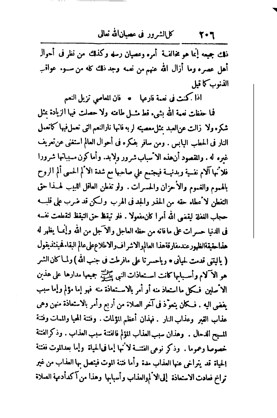 فما حفظت نعمة الله بشيء قط مثل طاعته ولا حصلت فيها الزيادة بمثل شكره ولا زالت عن العبد بمثل معصيته لربه فإنها نار النعم التي تعمل فيها كما تعمل النار في الحطب اليابس ومن سافر بفكره في أحوال العالم استغنى عن تعريف غيره له والمقصود أن هذه الأسباب شرور ولا بد وأما كون مسبباتها شرورا فلأنها آلام نفسية وبدنية فيجتمع على صاحبها مع شدة الألم الحسي ألم الروح بالهموم والغموم والأحزان والحسرات ولو تفطن العاقل اللبيب لهذا حق التفطن لأعطاه حقه من الحذر والجد في الهرب ولكن قد ضرب على قلبه حجاب الغفلة ليقضي الله أمرا كان مفعولا فلو تيقظ حق التيقظ لتقطعت نفسه في الدنيا حسرات على ما فاته من حظه العاجل والآجل من الله وإنما يظهر له هذا حقيقة الظهور عند مفارقة هذا العالم والإشراف والإطلاع على عالم البقاء فحينئذ يقول: {يَا لَيْتَنِي قَدَّمْتُ لِحَيَاتِي} و {حَسْرَتَى عَلَى مَا فَرَّطْتُ فِي جَنْبِ اللَّهِ} مدار المستعاذات على الآلام وأسبابها ولما كان الشر هو الآلام وأسبابها كانت استعاذات النبي صلى الله عليه وسلم جميعها مدارها على هذين الأصلين فكل ما استعاذ منه أو أمر بالاستعاذة منه فهو إما مؤلم وإما سبب يفضي إليه فكان يتعوذ في آخر الصلاة من أربع وأمر بالاستعاذة منهن وهي: "عذاب القبر وعذاب النار فهذان أعظم المؤلمات وفتنة المحيا والممات وفتنة المسيح الدجال " رواه البخاري ومسلم والنسائي وهذان سبب العذاب المؤلم فالفتنة سبب العذاب وذكر الفتنة خصوصا وعموما وذكر نوعي الفتنة لأنها إما في الحياة وإما بعد الموت ففتنة الحياة قد يتراخى عنها العذاب مدة وأما فتنة الموت فيتصل بها العذاب من غير تراخ فعادت الاستعاذة إلى الألم والعذاب وأسبابها وهذا من آكد أدعية الصلاة