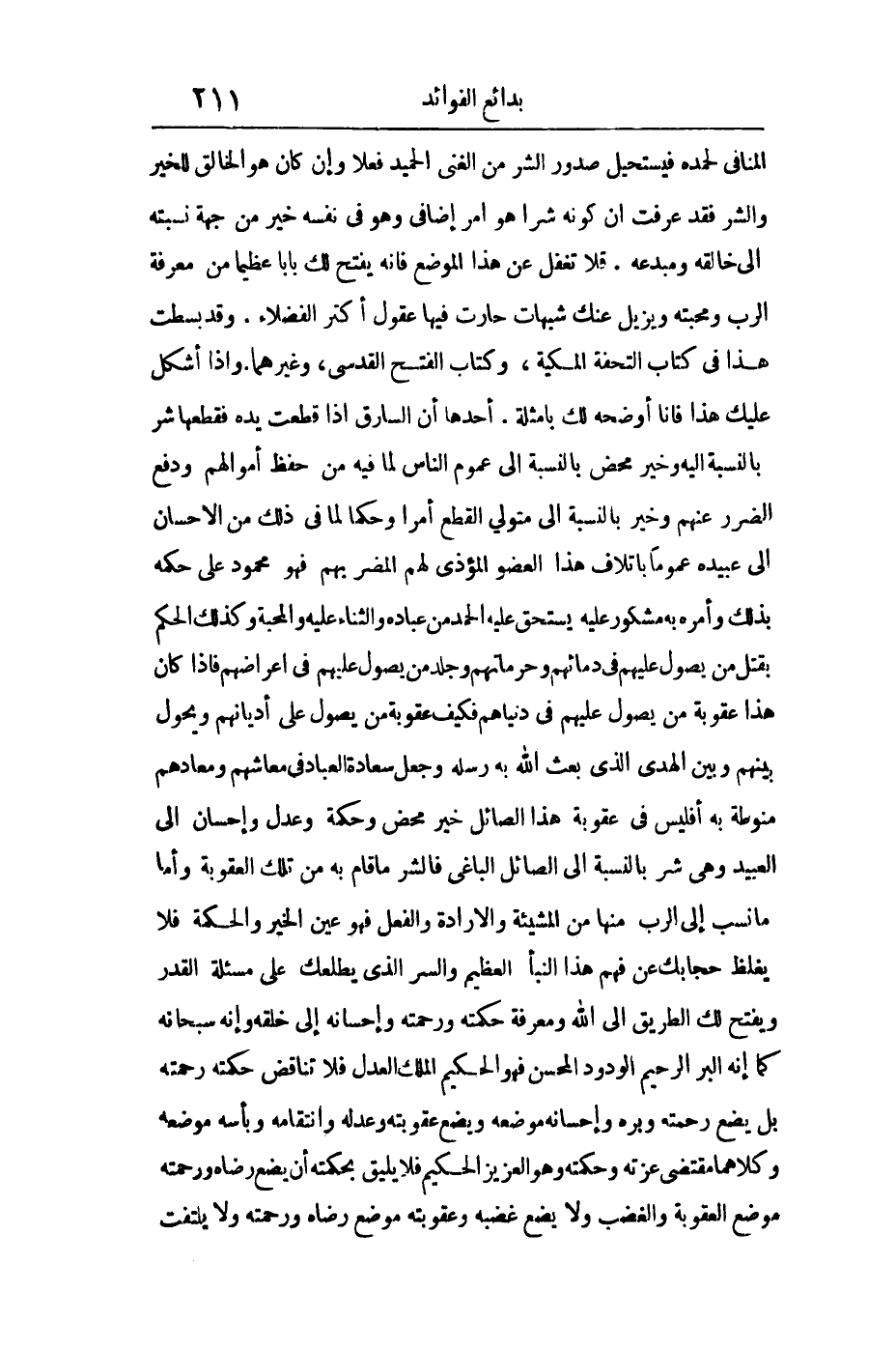 المنافي لحمده فيستحيل صدور الشر من الغني الحميد فعلا وإن كان هو الخالق للخير والشر فقد عرفت أن كونه شرا هو أمر إضافي وهو في نفسه خير من جهة نسبته إلى خالقه ومبدعه فلا تغفل عن هذا الموضع فإنه يفتح لك بابا عظيما من معرفة الرب ومحبته ويزيل عنك شبهات حارث فيها عقول أكثر الفضلاء وقد بسطت هذا في كتاب التحفة المكية وكتاب الفتح القدسي وغيرهما الشر في أفعاله تعالى أمر نسبي وإذا أشكل عليك هذا فأنا أوضحه لك بأمثلة أحدها أن السارق إذا قطعت يده فقطعها شر بالنسبة إليه وخير محض بالنسبة إلى عموم الناس لما فيه من حفظ أموالهم ودفع الضرر عنهم وخير بالنسبة إلى متولي القطع أمرا وحكما لما في ذلك من الإحسان إلى عبيده عموما بإتلاف هذا العضو المؤذي لهم المضر بهم فهو محمود على حكمه بذلك وأمره به مشكور عليه يستحق عليه الحمد من عباده والثناء عليه والمحبة وكذلك الحكم بقتل من يصول عليهم في دمائهم وحرماتهم وجلد من يصول عليهم في أعراضهم فإذا كان هذا عقوبة من يصول عليهم في دنياهم فكيف عقوبة من يصول على أديانهم ويحول بينهم وبين الهدى الذي بعث الله به رسله وجعل سعادة العباد في معاشهم ومعادهم منوطة به أفليس في عقوبة هذا الصائل خير محض وحكمة وعدل وإحسان إلى العبيد وهي شر بالنسبة إلى الصائل الباغي فالشر ما قام به من تلك العقوبة وأما ما نسب إلى الرب منها من المشيئة والإرادة والفعل فهو عين الخير والحكمة فلا يغلظ حجابك عن فهم هذا النبأ العظيم والسر الذي يطلعك على مسألة القدر ويفتح لك الطريق إلى الله ومعرفة حكمته ورحمته وإحسانه إلى خلقه وأنه سبحانه كما أنه البر الرحيم الودود المحسن فهو الحكيم الملك العدل فلا تناقض حكمته رحمته بل يضع رحمته وبره وإحسانه موضعه ويضع عقوبته وعدله وانتقامه وبأسه موضعه وكلاهما مقتضى عزته وحكمته وهو العزيز الحكيم فلا يليق بحكمته أن يضع رضاه ورحمته موضع العقوبة والغضب ولا يضع غضبه وعقوبته موضع رضاه ورحمته ولا يلتفت