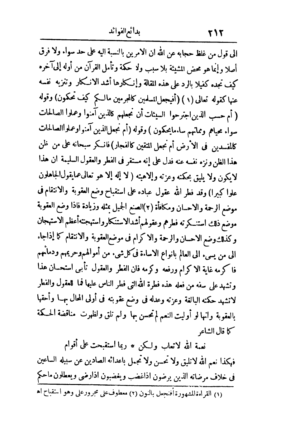 إلى قول من غلظ حجابه عن الله تعالى أن الأمرين بالنسبة إليه على حد سواء ولا فرق أصلا وإنما هو محض المشيئة بلا سبب ولا حكمة وتأمل القرآن من أوله إلى آخره كيف تجده كفيلا بالرد على هذه المقالة وإنكارها أشد الإنكار وتنزيه نفسه عنها كقوله تعالى: {أَفَنَجْعَلُ الْمُسْلِمِينَ كَالْمُجْرِمِينَ مَا لَكُمْ كَيْفَ تَحْكُمُونَ} وقوله: {أَمْ حَسِبَ الَّذِينَ اجْتَرَحُوا السَّيِّئَاتِ أَنْ نَجْعَلَهُمْ كَالَّذِينَ آمَنُوا وَعَمِلُوا الصَّالِحَاتِ سَوَاءً مَحْيَاهُمْ وَمَمَاتُهُمْ سَاءَ مَا يَحْكُمُونَ} وقوله: {أَمْ نَجْعَلُ الَّذِينَ آمَنُوا وَعَمِلُوا الصَّالِحَاتِ كَالْمُفْسِدِينَ فِي الأرْضِ أَمْ نَجْعَلُ الْمُتَّقِينَ كَالْفُجَّارِ} فأنكر سبحانه على من ظن هذا الظن ونزه نفسه عنه فدل على أنه مستقر في الفطر والعقول السليمة أن هذا لا يكون ولا يليق بحكمته وعزته وإلهيته "لا إله هو تعالى عما يقول الجاهلون علوا كبيرا" وقد فطر الله عقول عباده على استقباح وضع العقوبة والانتقام في موضع الرحمة والإحسان ومكافأة الصنع الجميل بمثله وزيادة فإذا وضع العقوبة موضع ذلك استنكرته فطرهم وعقولهم أشد الاستنكار واستهجنته أعظم الاستهجان وكذلك وضع الإحسان والإكرام في موضع العقوبة والانتقام كما إذا جاء إلى من يسيء إلى العالم بأنواع الإساءة في كل شيء من أموالهم وحريمهم ودمائهم فأكرمه غاية الإكرام ورفعه وكرمه فإن الفطر والعقول تأبى استحسان هذا وتشهد على سفه من فعله هذه فطرة الله التي فطر الناس عليها فما للعقول والفطر لا تشهد حكمته البالغة وعزته وعدله في وضع عقوبته في أولى المحال بها وأحقها بالعقوبة وأنها لو أوليت النعم لم تحسن بها ولم تلق ولظهرت مناقضة الحكمة كما قال الشاعر: