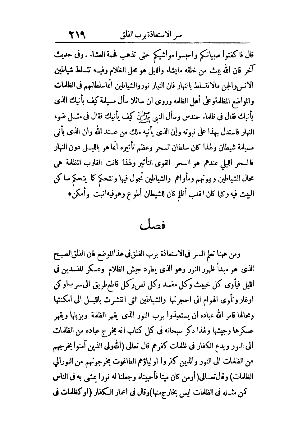 ومن هاهنا تعلم السر في الاستعاذة برب الفلق في هذا الموضع فإن الفلق الصبح الذي هو مبدأ ظهور النور وهو الذي يطرد جيش الظلام وعسكر المفسدين في الليل فيأوي كل خبيث وكل مفسد وكل لص وكل قاطع طريق إلى سرب أو كن أو غار وتأوي الهوام إلى أحجرتها والشياطين التي انتشرت بالليل إلى أمكنتها ومحالها فأمر الله تعالى عباده أن يستعيذوا برب النور الذي يقهر الظلمة ويزيلها ويقهر عسكرها وجيشها ولهذا ذكر سبحانه في كل كتاب أنه يخرج عباده من الظلمات إلى النور ويدع الكفار في ظلمات كفرهم قال تعالى: {اللَّهُ وَلِيُّ الَّذِينَ آمَنُوا يُخْرِجُهُمْ مِنَ الظُّلُمَاتِ إِلَى النُّورِ وَالَّذِينَ كَفَرُوا أَوْلِيَاؤُهُمُ الطَّاغُوتُ يُخْرِجُونَهُمْ مِنَ النُّورِ إِلَى الظُّلُمَاتِ} وقال تعالى: {أَوَمَنْ كَانَ مَيْتاً فَأَحْيَيْنَاهُ وَجَعَلْنَا لَهُ نُوراً يَمْشِي بِهِ فِي النَّاسِ كَمَنْ مَثَلُهُ فِي الظُّلُمَاتِ لَيْسَ بِخَارِجٍ مِنْهَا} وقال في أعمار الكفار: {أَوْ كَظُلُمَاتٍ فِي