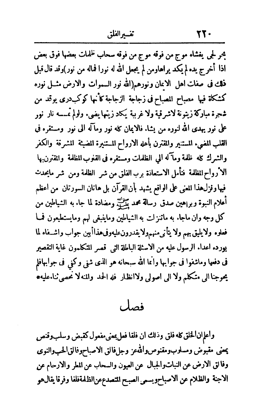 بَحْرٍ لُجِّيٍّ يَغْشَاهُ مَوْجٌ مِنْ فَوْقِهِ مَوْجٌ مِنْ فَوْقِهِ سَحَابٌ ظُلُمَاتٌ بَعْضُهَا فَوْقَ بَعْضٍ إِذَا أَخْرَجَ يَدَهُ لَمْ يَكَدْ يَرَاهَا وَمَنْ لَمْ يَجْعَلِ اللَّهُ لَهُ نُوراً فَمَا لَهُ مِنْ نُورٍ} وقد قال قبل ذلك في صفات أهل الإيمان ونورهم {اللَّهُ نُورُ السَّمَاوَاتِ وَالأَرْضِ مَثَلُ نُورِهِ كَمِشْكَاةٍ فِيهَا مِصْبَاحٌ الْمِصْبَاحُ فِي زُجَاجَةٍ الزُّجَاجَةُ كَأَنَّهَا كَوْكَبٌ دُرِّيٌّ يُوقَدُ مِنْ شَجَرَةٍ مُبَارَكَةٍ زَيْتُونَةٍ لا شَرْقِيَّةٍ وَلا غَرْبِيَّةٍ يَكَادُ زَيْتُهَا يُضِيءُ وَلَوْ لَمْ تَمْسَسْهُ نَارٌ نُورٌ عَلَى نُورٍ يَهْدِي اللَّهُ لِنُورِهِ مَنْ يَشَاءُ} فالإيمان كله نور ومآله إلى نور ومستقره في القلب المضيء المستنير والمقترن بأهله الأرواح المستنيرة المضيئة المشرقة والكفر والشرك كله ظلمة ومآله إلى الظلمات ومستقره في القلوب المظلمة والمقترن بها الأرواح المظلمة فتأمل الاستعاذة برب الفلق من شر الظلمة ومن شر ما يحدث فيها ونزول هذا المعنى على الواقع يشهد بأن القرآن بل هاتان السورتان من أعظم أعلام النبوة وبراهين صدق رسالة محمد ومضادة لما جاء به الشياطين من كل وجه وإن ما جاء به ما تنزلت به الشياطين وما ينبغي لهم وما يستطيعون فما فعلوه ولا يليق بهم ولا يتأتى منهم ولا يقدرون عليه وفي هذا أبين جواب وأشفاه لما يورده أعداء الرسول عليه من الأسئلة الباطلة التي قصر المتكلمون غاية التقصير في دفعها وما شفوا في جوابها وإنما الله سبحانه هو الذي شفى وكفى في جوابها فلم يحوجنا إلى متكلم ولا إلى أصولي ولا أنظار فله الحمد والمنة لا نحصي ثناء عليه.