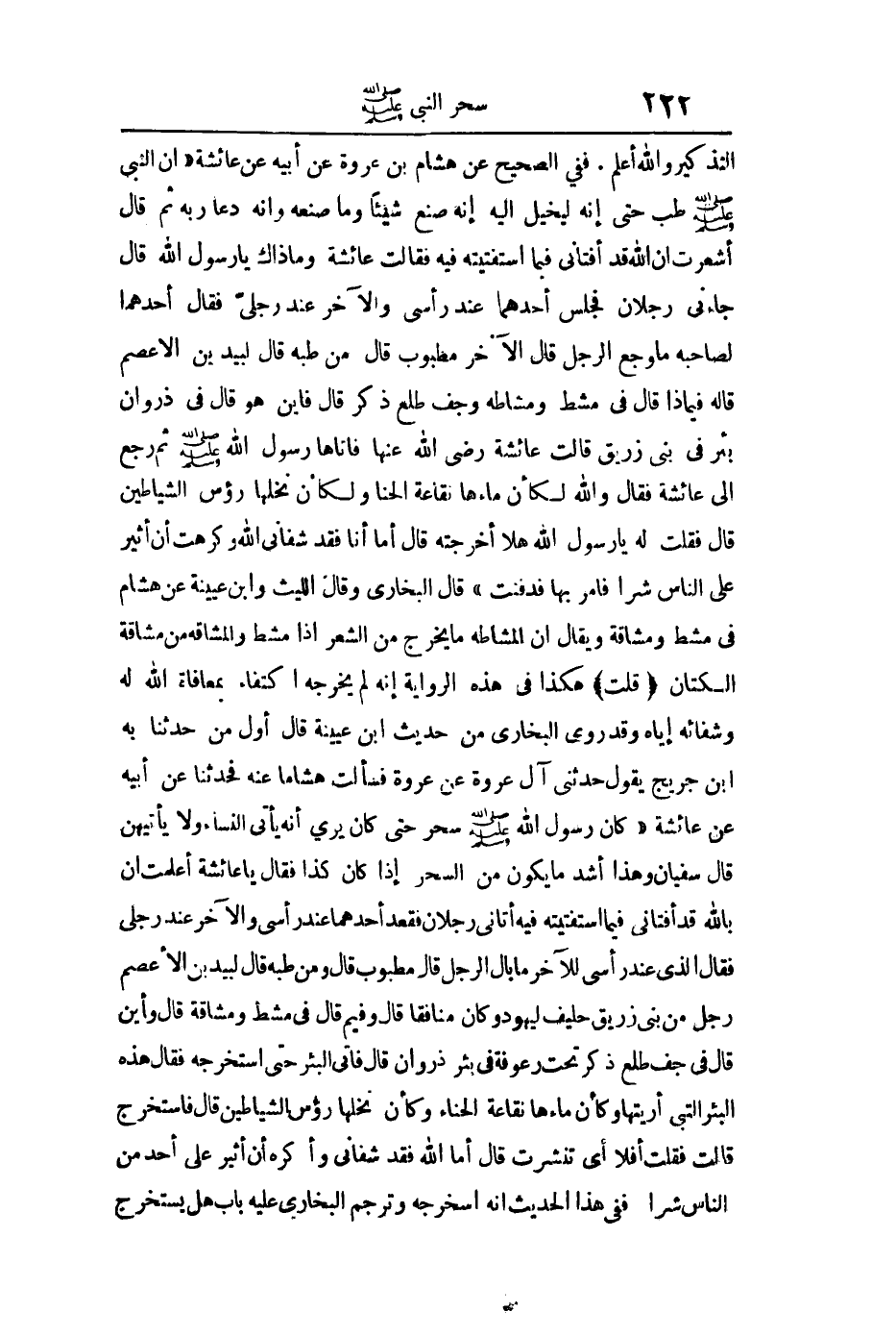 التذكير والله أعلم ففي الصحيح عن هاشم بن عروة عن أبيه عن عائشة "أن النبي صلى الله عليه وسلم طب حتى إنه ليخيل إليه أنه صنع شيئا وما صنعه وأنها دعا ربه ثم قال أشعرت أن الله قد أفتاني فيما استفتيته فيه فقالت عائشة: وما ذاك يا رسول الله قال جاءني رجلان فجلس أحدهما عند رأسي والآخر عند رجلي فقال أحدهما لصاحبه ما وجع الرجل قال الآخر مطبوب قال من طبه قال لبيد بن الأعصم قال له فبماذا قال في مشط ومشاطه وجف طلع ذكر قال فأين هو قال في ذروان بئر في بني زريق قالت عائشة رضي الله عنها: فأتاها رسول الله صلى الله عليه وسلم ثم رجع إلى عائشة رضي الله عنها فقال والله لكأن ماءها نقاعة الحناء ولكأن نخلها رءوس الشياطين قال فقلت له: يا رسول الله هلا أخرجته قال أما أنا فقد شفاني الله وكرهت أن أثير على الناس شرا فأمر بها فدفنت" رواه البخاري ومسلم قال البخاري وقال الليث وسفيان بن عيينة عن هشام في مشط ومشافة ويقال أن المشاطة ما يخرج من الشعر إذا مشط والمشاقة من مشاقة الكتان قلت: هكذا في هذه الرواية إنه لم يخرجه اكتفاء بمعافاة الله له وشفائه إياه وقد روى البخاري من حديث سفيان بن عيينة قال أول من حدثنا به ابن جريج يقول حدثني آل عروة عن عروة فسألت هشام عنه فحدثنا عن أبيه عن عائشة: "كان رسول الله صلى الله عليه وسلم سحر حتى كان يرى أنه يأتي النساء ولا يأتيهن قال سفيان وهذا أشد ما يكون من السحر إذا كان كذا فقال يا عائشة أعلمت أن الله قد أفتاني فيما استفتيته فيه أتاني رجلان فقعد أحدهما عند رأسي والآخر عند رجلي فقال الذي عند رأسي للآخر ما بال الرجل قال مطبوب قال ومن طبه قال لبيد بن الأعصم رجل من بني زريق حليف ليهود وكان منافقا قال وفيم قال في مشط ومشاطة قال وأين قال في جف طلع ذكر تحت رعوفة في بئر ذروان قال فأتى البئر حتى استخرجه فقال هذه البئر التي أريتها وكأن ماءها نقاعة الحناء وكأن نخلها رءوس الشياطين قال فاستخرج أما الله فقد شفاني وأكره أن أثير على أحد من الناس شرا" رواه البخاري ففي هذا الحديث أنه استخرجه وترجم البخاري عليه باب هل يستخرج