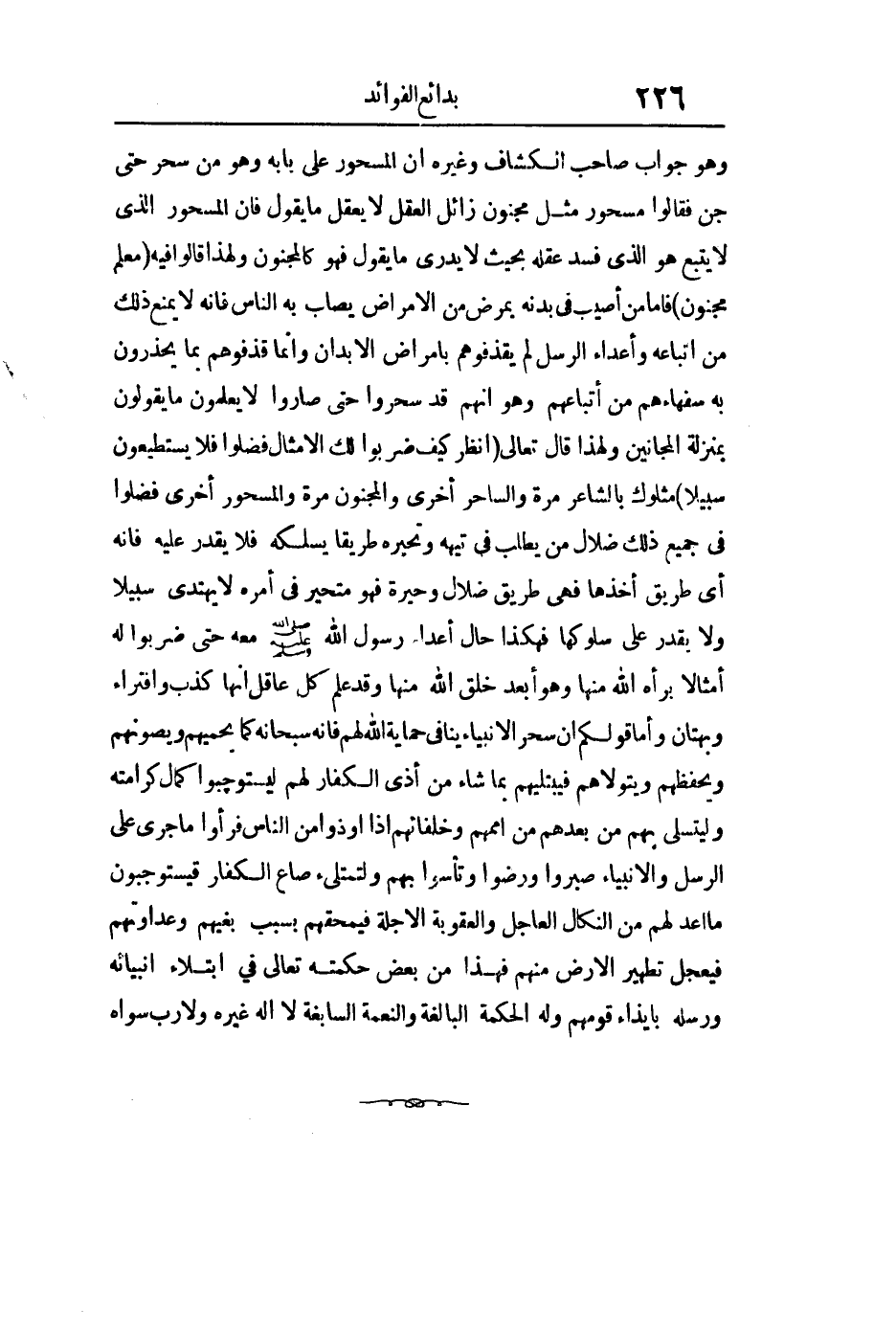 وهو جواب صاحب الكشاف وغيره إن المسحور على بابه وهو من سحر حتى جن فقالوا مسحور مثل مجنون زائل العقل لا يعقل ما يقول فإن المسحور الذي لا يتبع هو الذي فسد عقله بحيث لا يدري ما يقول فهو كالمجنون ولهذا قالوا فيه معلم مجنون فأما من أصيب في بده بمرض من الأمراض يصاب به الناس فإنه لا يمنع ذلك من اتباعه وأعداء الرسل لم يقذفوهم بأمراض الأبدان وإنما قذفوهم بما يحذرون به سفهاءهم من اتباعهم وهو أنهم قد سحروا حتى صاروا لا يعلمون ما يقولون بمنزلة المجانين ولهذا قال تعالى: {انْظُرْ كَيْفَ ضَرَبُوا لَكَ الأمْثَالَ فَضَلُّوا فَلا يَسْتَطِيعُونَ سَبِيلاً} مثلوك بالشاعر مرة والساحر أخرى والمجنون مرة والمسحور أخرى فضلوا في جميع ذلك ضلال من يطلب في تيهه وتحيره طريقا يسلكه فلا يقدر عليه فإن أي طريق أخذها فهي طريق ضلال وحيرة فهو متحير في أمره لا يهتدي سبيلا ولا يقدر على سلوكها فهكذا حال أعداء رسول الله صلى الله عليه وسلم معه حتى ضربوا له أمثالا برأه الله منها وهو أبعد خلق الله منها وقد علم كل عاقل أنها كذب وافتراء وبهتان وأما قولكم إن سحر الأنبياء ينافي حماية الله تعالى لهم فإنه سبحانه كما يحميهم ويصونهم ويحفظهم ويتولاهم فيبتليهم بما شاء من أذى الكفار لهم ليستوجبوا كمال كرامته وليتسلى بهم من بعدهم من أممهم وخلفائهم إذا أوذوا من الناس فرأوا ما جرى على الرسل والأنبياء صبروا ورضوا وتأسوا بهم ولتمتلئ صاع الكفار فيستوجبون ما أعد لهم من النكال العاجل والعقوبة الآجلة فيمحقهم بسبب بغيهم وعداوتهم فيعجل تطهير الأرض منهم فهذا من بعض حكمته تعالى في ابتلاء أنبيائه ورسله بإيذاء قومهم وله الحكمة البالغة والنعمة السابغة لا إله غيره ولا رب سواه.