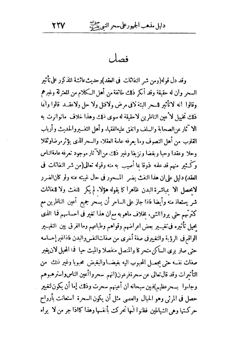 وقد دل قوله: {وَمِنْ شَرِّ النَّفَّاثَاتِ فِي الْعُقَدِ} وحديث عائشة المذكور: على تأثير السحر وأن له حقيقة وقد أنكر ذلك طائفة من أهل الكلام من المعتزلة وغيرهم وقالوا إنه لا تأثير للسحر البتة لا في مرض ولا قتل ولا حل ولا عقد قالوا وإنما ذلك تخيل لأعين الناظرين لا حقيقة له سوى ذلك وهذا خلاف ما تواترت به الآثار عن الصحابة والسلف واتفق عليه الفقهاء وأهل التفسير والحديث وأرباب القلوب من أهل التصوف وما يعرفه عامة العقلاء والسحر الذي يؤثر مرضا وثقلا وحلا وعقدا وحبا وبغضا وتزينا وغير ذلك من الآثار موجود تعرفه عامة الناس وكثير منهم قد علمه ذوقا بما أصيب به منه وقوله تعالى: {مِنْ شَرِّ النَّفَّاثَاتِ فِي الْعُقَدِ} دليل على أن هذا النفث يضر المسحور في حال غيبته عنه ولو كان الضرر لا يحصل إلا بمباشرة البدن ظاهرا كما يقوله هؤلاء لم يكن للنفث ولا للنفاثات شر يستعاذ منه وأيضا فإذا جاز على الساحر أن يسحر جميع أعين الناظرين مع كثرتهم حتى يروا الشيء بخلاف ما هو به مع أن هذا تغير في إحساسهم فما الذي يحيل تأثيره في تغيير بعض أعراضهم وقواهم وطباعهم وما الفرق بين التغيير الواقع في الرؤية والتغيير في صفة أخرى من صفات النفس والبدن فإذا غير إحساسه حتى صار يرى الساكن متحركا والمتصل منفصلا والميت حيا فما المحيل لأن يغير صفات نفسه حتى يجعل المحبوب إليه بغيضا والبغيض محبوبا وغير ذلك من التأثيرات وقد قال تعالى عن سحرة فرعون إنهم {سَحَرُوا أَعْيُنَ النَّاسِ وَاسْتَرْهَبُوهُمْ وَجَاءُوا بِسِحْرٍ عَظِيمٍ} فبين سبحانه أن أعينهم سحرت وذلك إما أن يكون لتغيير حصل في المرئي وهو الحبال والعصي مثل أن يكون السحرة استعانت بأرواح حركتها وهي الشياطين فظنوا أنها تحركت بأنفسها وهذا كما إذا جر من لا يراه