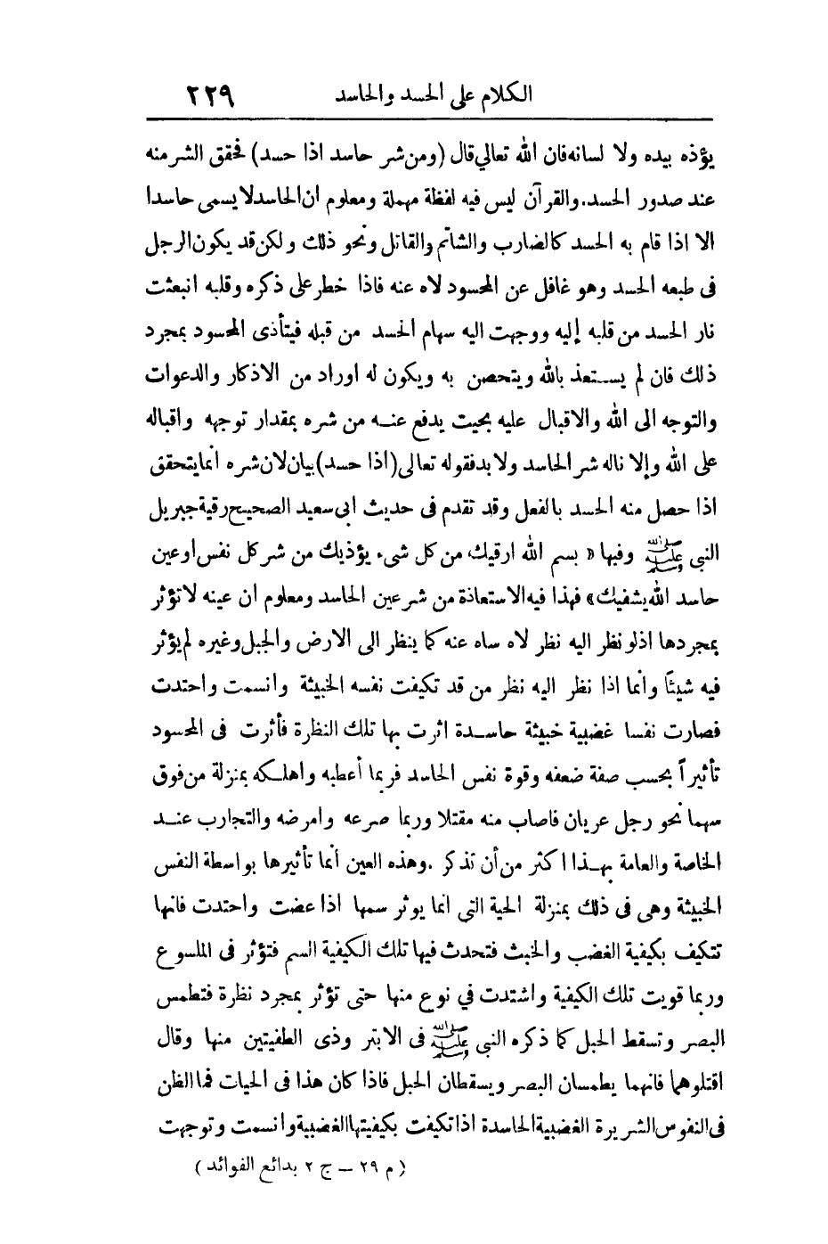 يؤذه بيده ولا لسانه فإن الله تعالى قال: {وَمِنْ شَرِّ حَاسِدٍ إِذَا حَسَدَ} فحقق الشر منه عند صدور الحسد والقرآن ليس فيه لفظة مهملة ومعلوم أن الحاسد لا يسمى حاسدا إلا إذا قام به الحسد كالضارب والشاتم والقاتل ونحو ذلك ولكن قد يكون الرجل في طبعه الحسد وهو غافل عن المحسود لاه عنه فإن خطر على ذكره وقلبه انبعثت نار الحسد من قلبه إليه ووجهت إليه سهام الحسد من قبله فيتأذى المحسود بمجرد ذلك فإن لم يستعذ بالله ويتحصن به ويكون له أوراد من الأذكار والدعوات والتوجه إلى الله والإقبال عليه بحيث يدفع عنه من شره بمقدار توجهه وإقباله على الله وإلا ناله شر الحاسد ولا بد فقوله تعالى: {إِذَا حَسَدَ} بيان لأن شره إنما يتحقق إذا حصل منه الحسد بالفعل تأثير العين وقد تقدم في حديث أبي سعيد الخدري الصحيح رقية جبريل النبي صلى الله عليه وسلم وفيها: "بسم الله أرقيك من كل شيء يؤذيك من شر كل نفس أو عين حاسد الله يشفيك" فهذا فيه الاستعاذة من شر عين الحاسد ومعلوم أن عينه لا تؤثر بمجردها إذ لو نظر إليه نظر لاه ساه عنه كما ينظر إلى الأرض والجبل وغيره لم يؤثر فيه شيئا وإنما إذا نظر إليه نظر من قد تكيفت نفسه الخبيثة واتسمت واحتدت فصارت نفسا غضبية خبيثة حاسدة أثرت بها تلك النظرة فأثرت في المحسود تأثيرا بحسب صفة ضعفه وقوة نفس الحاسد فربما أعطيه وأهلكه بمنزلة من فوق سهما نحو رجل عريان فأصاب منه مقتلا وربما صرعه وأمرضه والتجارب عند الخاصة والعامة بهذا أكثر من أن تذكر وهذه العين إنما تأثيرها بواسطة النفس الخبيثة وهي في ذلك بمنزلة الحية التي إنما يؤثر سمها إذا عضت واحتدت فإنها تتكيف بكيفية الغضب والخبث فتحدث فيها تلك الكيفية السم فتؤثر في الملسوع وربما قويت تلك الكيفية واشتدت في نوع منها حتى تؤثر بمجرد نظرة فتطمس البصر وتسقط الحبل كما ذكره النبي صلى الله عليه وسلم في الأبتر وذي الطفيتين منها: وقال:"اقتلوهما فإنهما يطمسان البصر ويسقطان الحبل" رواه البخاري ومسلم فإذا كان هذا في الحيات فما الظن في النفوس الشريرة الغضبية الحاسدة إذا تكيفت بكيفيتها الغضبية واتسمت وتوجهت
