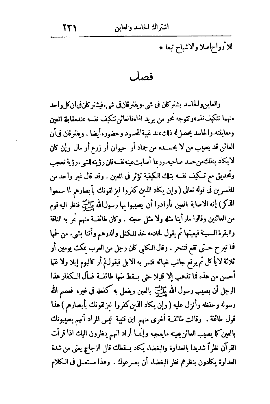 والعاين والحاسد يشتركان في شيء ويفترقان في شيء فيشتركان في أن كل واحد منهما تتكيف نفسه وتتوجه نحو من يريد أذاه فالعائن تتكيف نفسه عند مقابلة المعين ومعاينته والحاسد يحصل له ذلك عند غيب المحسود وحضوره أيضا ويفترقان في أن العائن قد يصيب من لا يحسده من جماد أو حيوان أو زرع أو مال وإن كان لا يكاد ينفك من حسد صاحبه وربما أصابت عينه نفسه فإن رؤيته للشيء رؤية تعجب وتحديق مع تكيف نفسه بتلك الكيفية تؤثر في المعين وقد قال غير واحد من المفسرين في قوله تعالى: {وَإِنْ يَكَادُ الَّذِينَ كَفَرُوا لَيُزْلِقُونَكَ بِأَبْصَارِهِمْ لَمَّا سَمِعُوا الذِّكْرَ} إنه الإصابة بالعين فأرادوا أن يصيبوا بها رسول الله صلى الله عليه وسلم فنظر إليه قوم من العائنين وقالوا ما رأينا مثله ولا مثل حجته وكان طائفة منهم تمر به الناقة والبقرة السمينة فيعينها ثم يقول لخادمه خذ المكتل والدرهم وآتنا بشيء من لحمها فما تبرح حتى تقع فتنحر وقال الكلبي: "كان رجل من العرب يمكث يومين أو ثلاثة لا يأكل ثم يرفع جانب خبائة فتمر به الإبل فيقول لم أر كاليوم إبلا ولا غنما أحسن من هذه فما تذهب إلا قليلا حتى يسقط منها طائفة فسأل الكفار هذا الرجل أن يصيب رسول الله صلى الله عليه وسلم بالعين ويفعل به كفعله في غيره فعصم الله تعالى رسوله وحفظه وأنزل عليه: {وَإِنْ يَكَادُ الَّذِينَ كَفَرُوا لَيُزْلِقُونَكَ بِأَبْصَارِهِمْ} هذا قول طائفة وقالت طائفة أخرى منهم ابن قتيبة: ليس المراد أنهم يصيبونك بالعين كما يصيب العائن بعينه ما يعجبه وإنما أراد أنهم ينظرون إليك إذا قرأت القرآن الكريم نظرا شديدا بالعداوة والبغضاء يكاد يسقطك قال الزجاج: "يعني من شدة العداوة يكادون بنظرهم نظر البغضاء أن يصرعوك" وهذا مستعمل في الكلام