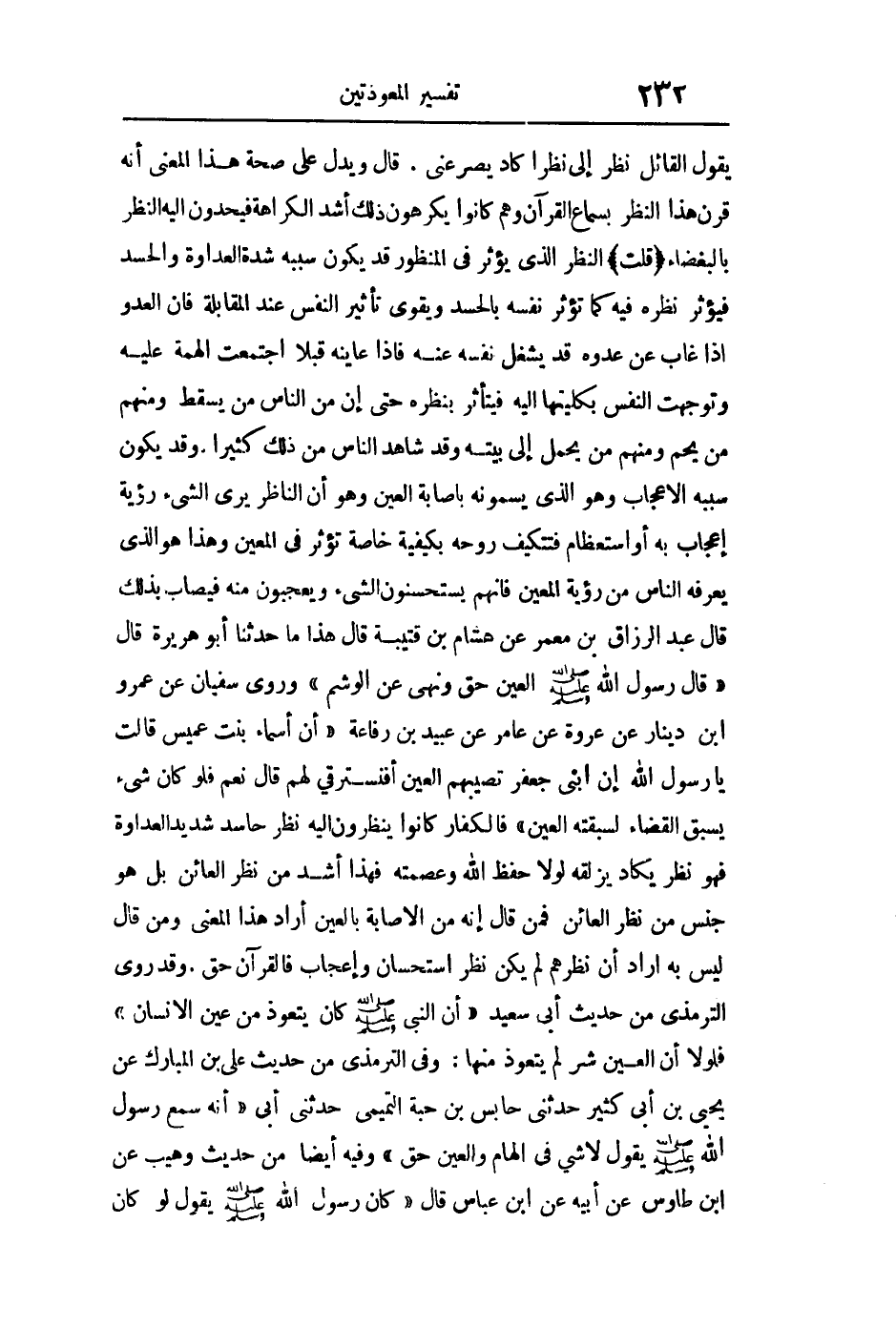 يقول القائل: نظر إلي نظر قد كان يصرعني، قال: ويدل على صحة هذا المعنى أنه قرن هذا النظر بسماع القرآن الكريم وهم كانوا يكرهون ذلك أشد الكراهة فيحدون إليه النظر بالبغضاء النظر الذي يؤثر في المنظور قلت: النظر الذي يؤثر في المنظور قد يكون بسببه شده العداوة والحسد فيؤثر نظره في كما تؤثر نفسه بالحسد ويقوى تأثير النفس عند المقابلة فإن العدو إذا غاب عن عدوه قد يشغل نفسه عنه فإذا عاينه قبلا اجتمعت الهمة عليه وتوجهت النفس بكليتها إليه فيتأثر بنظره حتى إن من الناس من يسقط ومنهم من يحم ومنهم من يحمل إلى بيته وقد شاهد الناس من ذلك كثيرا وقد يكون سببه الإعجاب وهو الذي يسمونه بإصابة العين وهو أن الناظر يرى الشيء رؤية إعجاب به أو استعظام فتتكيف روحه بكيفية خاصة تؤثر في المعين وهذا هو الذي يعرفه الناس من رؤية المعين فإنهم يستحسنون الشيء ويعجبون منه فيصاب بذلك قال عبد الرزاق بن معمر عن هشام بن قتيبة قال: هذا ما حدثنا أبو هريرة قال قال رسول الله صلى الله عليه وسلم "العين حق" رواه البخاري ومسلم "ونهى عن الوشم" رواه البخاري ومسلم وروى سفيان عن عمرو بن دينار عن عروة عن عامر عن عبيد بن رفاعة أن أسماء بنت عميس قالت يا رسول الله صلى الله عليه وسلم "إن ابني جعفر تصيبهم العين أفتسترقي لهم قال: نعم فلو كان شيء يسبق القضاء لسبقته العين" صحيح فالكفار كانوا ينظرون إليه نظر حاسد شديد العدواة فهو نظر يكاد يزلقه لولا حفظ الله وعصمته فهذا أشد من نظر العائن بل هو جنس من نظر العائن فمن قال إنه من الإصابة بالعين أراد هذا المعنى ومن قال: ليس به أراد أن نظرهم لم يكن نظر استحسان وإعجاب فالقرآن الكريم حق وقد روى الترمذي من حديث أبي سعيد: "أن النبي صلى الله عليه وسلم كان يتعوذ من عين الإنسان" صحيح فلولا أن العين شر لم يتعوذ منها وفي الترمذي من حديث علي بن المبارك عن يحيى بن أبي كثير حدثني حابس بن حبة التميمي حدثني أبي "أنه سمع رسول الله صلى الله عليه وسلم يقول: لا شيء في الهام والعين حق " ضعيف لكن قوله "والعين حق" صحيح وفيه أيضا من حديث وهيب عن ابن طاوس عن أبيه عن ابن عباس قال: " كان رسول الله صلى الله عليه وسلم يقول لو كان