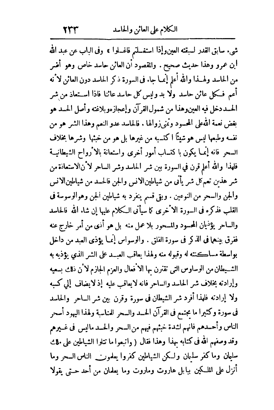 شيء سابق القدر لسبقته العين وإذا استغسلتم فاغسلوا " رواه مسلم وفي الباب عن عبد الله بن عمر وهذا حديث صحيح والمقصود أن العائن حاسد خاص وهو أضر من الحاسد ولهذا والله أعلم إنما جاء في السورة ذكر الحاسد دون العائن لأنه أعم فكل عائن حاسد ولا بد وليس كل حاسد عائنا فإذا استعاذ من شر الحسد دخل فيه العين وهذا من شمول القرآن الكريم وإعجازه وبلاغته وأصل الحسد هو بغض نعمة الله على المحسود وتمني زوالها الساحر والحاسد فالحاسد عدو النعم وهذا الشر هو من نفس الحاسد وطبعها ليس هو شيئا اكتسبه من غيرها بل هو من خبثها وشرها بخلاف السحر فإنه إنما يكون باكتساب أمور أخرى واستعانة بالأرواح الشيطانية فلهذا والله أعلم قرن في السورة بين: شر الحاسد وشر الساحر لأن الاستعاذة من شر هذين تعم كل شر يأتي من شياطين الإنس والجن فالحسد من شياطين الإنس والجن والسحر من النوعين وبقي قسم ينفرد به شياطين الجن وهو الوسوسة في القلب فذكره في السورة الأخرى كما سيأتي الكلام عليها إن شاء الله تعالى فالحاسد والساحر يؤذيان المحسود والمسحور بلا عمل منه بل هو أذى من أمر خارج عنه ففرق بينهما في الذكر في سورة الفلق والوسواس إنما يؤذي العبد من داخله بواسطة مساكنته له وقبوله منه ولهذا يعاقب العبد على الشر الذي يؤذيه به الشيطان من الوساوس التي تقترن بها الأفعال والعزم الجازم لأن ذلك بسعيه وإرادته بخلاف شر الحاسد والساحر فإنه لا يعاقب عليه إذ لا يضاف إلى كسبه ولا إرادته فلهذا أفرد شر الشيطان في سورة وقرن بين شر الساحر والحاسد في سورة وكثيرا ما يجتمع في القرآن الحسد والسحر للمناسبة ولهذا اليهود أسحر الناس وأحسدهم فإنهم لشدة خبثهم فيهم من السحر والحسد ما ليس في غيرهم وقد وصفهم الله تعالى في كتابه بهذا وهذا فقال: {وَاتَّبَعُوا مَا تَتْلُوا الشَّيَاطِينُ عَلَى مُلْكِ سُلَيْمَانَ وَمَا كَفَرَ سُلَيْمَانُ وَلَكِنَّ الشَّيَاطِينَ كَفَرُوا يُعَلِّمُونَ النَّاسَ السِّحْرَ وَمَا أُنْزِلَ عَلَى الْمَلَكَيْنِ بِبَابِلَ هَارُوتَ وَمَارُوتَ وَمَا يُعَلِّمَانِ مِنْ أَحَدٍ حَتَّى يَقُولا