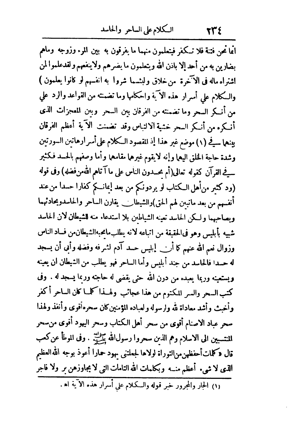 إِنَّمَا نَحْنُ فِتْنَةٌ فَلا تَكْفُرْ فَيَتَعَلَّمُونَ مِنْهُمَا مَا يُفَرِّقُونَ بِهِ بَيْنَ الْمَرْءِ وَزَوْجِهِ وَمَا هُمْ بِضَارِّينَ بِهِ مِنْ أَحَدٍ إِلاّ بِإِذْنِ اللَّهِ وَيَتَعَلَّمُونَ مَا يَضُرُّهُمْ وَلا يَنْفَعُهُمْ وَلَقَدْ عَلِمُوا لَمَنِ اشْتَرَاهُ مَا لَهُ فِي الآخِرَةِ مِنْ خَلاقٍ وَلَبِئْسَ مَا شَرَوْا بِهِ أَنْفُسَهُمْ لَوْ كَانُوا يَعْلَمُونَ} والكلام على أسرار هذه الآية وأحكامها وما تضمنته من القواعد والرد على من أنكر السحر وما تضمنته من الفرقان بين السحر وبين المعجزات الذي أنكره من أنكر السحر خشية الالتباس وقد تضمنت الآية أعظم الفرقان بينهما في موضع غير هذا إذ المقصود الكلام على أسرار هاتين السورتين وشدة حاجة الخلق إليهما وإن لا يقوم غيرهما مقامهما وأما وصفهم بالحسد فكثير في القرآن كقوله تعالى: {أَمْ يَحْسُدُونَ النَّاسَ عَلَى مَا آتَاهُمُ اللَّهُ مِنْ فَضْلِهِ} وفي قوله: {وَدَّ كَثِيرٌ مِنْ أَهْلِ الْكِتَابِ لَوْ يَرُدُّونَكُمْ مِنْ بَعْدِ إِيمَانِكُمْ كُفَّاراً حَسَداً مِنْ عِنْدِ أَنْفُسِهِمْ مِنْ بَعْدِ مَا تَبَيَّنَ لَهُمُ الْحَقُّ} والشيطان يقارن الساحر والحاسد ويحادثهما ويصاحبها ولكن الحاسد تعينه الشياطين بلا استدعاء منه للشيطان لأن الحاسد شبيه بإبليس وهو في الحقيقة من أتباعه لأنه يطلب ما يحبه الشيطان من فساد الناس وزوال نعم الله عنهم كما أن إبليس حسد آدم لشرفه وفضله وأبى أن يسجد له حسدا فالحاسد من جند إبليس وأما الساحر فهو يطلب من الشيطان أن يعينه ويستعينه وربما يعبده من دون الله تعالى حتى يقضي له حاجته وربما يسجد له وفي كتب السحر والسر المكتوم من هذا عجائب ولهذا كلما كان الساحر أكفر وأخبث وأشد معاداة لله ولرسوله ولعباده المؤمنين كان سحره أقوى وأنفذ ولهذا كان سحر عباد الأصنام أقوى من سحر أهل الكتاب وسحر اليهود أقوى من سحر المنتسبين إلى الإسلام وهم الذين سحروا رسول الله صلى الله عليه وسلم وفي الموطأ عن كعب قال: "كلمات أحفظهن من التوراة لولاها لجعلتني يهود حمارا أعوذ بوجه الله العظيم الذي لا شيء أعظم منه وبكلمات الله التامات التي لا يجاوزهن بر ولا فاجر