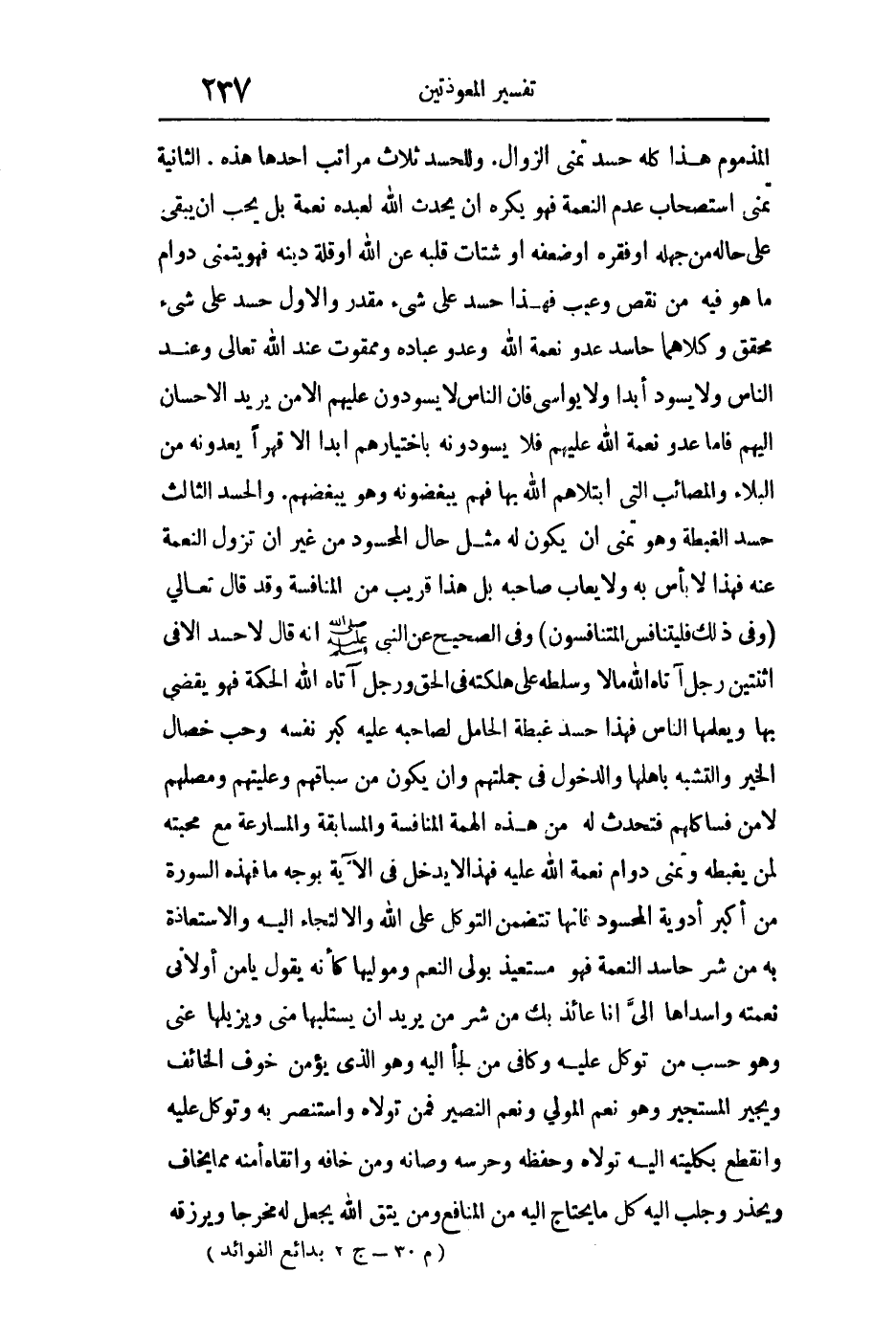 المذموم هو كله حسد تمني الزوال وللحسد ثلاث مراتب أحدهما: هي هذه الثانية: وهي تمني استصحاب عدم النعمة فهو يكره أن يحدث الله لعبده نعمة بل يحب أن يبقى على حاله من جهله أو فقره أو ضعفه أو شتات قلبه عن الله أو قلة دينه فهو يتمنى دوام ما هو فيه من نقص وعيب فهذا حسد على شيء مقدر والأول حسد على شيء محقق وكلاهما حاسد عدو نعمة وعدو عباده وممقوت عند الله تعالى وعند الناس ولا يسود أبدا ولا يواسي فإن الناس لا يسودون عليهم إلا من يريد الإحسان إليهم فأما عدو نعمة الله عليهم فلا يسودونه باختيارهم أبدا إلا قهرا يعدونه من البلاء والمصائب التي ابتلاهم الله بها فهم يبغضونه وهو يبغضهم والحسد الثالث حسد الغبطة وهو تمني أن يكون له مثل حال المحسود من غير أن تزول النعمة عنه فهذا لا بأس به ولا يعاب صاحبه بل هذا قريب من المنافسة وقد قال تعالى: {وَفِي ذَلِكَ فَلْيَتَنَافَسِ الْمُتَنَافِسُونَ} خطأ يبحثها المحقق وفي الصحيح عن النبي صلى الله عليه وسلم أنه قال: "لا حسد إلا في اثنتين رجل آتاه الله مالا وسلطه على هلكته في الحق ورجل آتاه الله الحكمة فهو يقضي بها ويعلمها الناس" رواه البخاري ومسلم فهذا حسد غبطة الحامل لصاحبه عليه كبر نفسه وحب خصال الخير والتشبه بأهلها والدخول في جملتهم وأن يكون من سباقهم وعليتهم ومصلهم لا من فساكلهم فتحدث له من هذه الهمة المنافسة والمسابقة والمسارعة مع محبته لمن يغبطه وتمني دوام نعمة الله عليه فهذا لا يدخل في الآية بوجه ما فهذه السورة من أكبر أدوية المحسود فإنها تتضمن التوكل على الله والالتجاء إليه والاستعاذة به من شر حاسد النعمة فهو مستعيذ بولي النعم وموليها كأنه يقول يا من أولاني نعمته وأسداها إلي أنا عائذ بك من شر من يريد أن يستلبها مني ويزيلها عني وهو حسب من توكل عليه وكافي من لجأ إليه وهو الذي يؤمن خوف الخائف ويجبر المستجير وهو نعم المولى ونعم النصير فمن تولاه واستنصر به وتوكل عليه وانقطع بكليته إليه تولاه وحفظه وحرسه وصانه ومن خافه واتقاه آمنه مما يخاف ويحذر وجلب إليه كل ما يحتاج إليه من المنافع: {وَمَنْ يَتَّقِ اللَّهَ يَجْعَلْ لَهُ مَخْرَجاً وَيَرْزُقْهُ