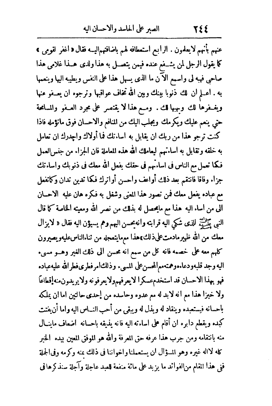 عنهم بأنهم لا يعلمون الرابع: استعطافه لهم بإضافتهم إليه فقال اغفر لقومي كما يقول الرجل لمن يشفع عنده فيمن يتصل به هذا ولدي هذا غلامي هذا صاحبي فهبه لي واسمع الآن ما الذي يسهل هذا على النفس ويطيبه إليها وينعمها به اعلم أن لك ذنوبا بينك وبين الله تخاف عواقبها وترجوه أن يعفو عنها ويغفرها لك ويهبها لك ومع هذا لا يقتصر على مجرد العفو والمسامحة حتى ينعم عليك ويكرمك ويجلب إليك من المنافع والإحسان فوق ما تؤمله فإذا كنت ترجو هذا من ربك أن يقابل به إساءتك فما أولاك وأجدرك أن تعامل به خلقه وتقابل به إساءتهم ليعاملك الله هذه المعاملة فإن الجزاء من جنس العمل فكما تعمل مع الناس في إساءتهم في حقك يفعل الله معك في ذنوبك وإساءتك جزاء وفاقا فانتقم بعد ذلك أو اعف وأحسن أو اترك فكما تدين تدان وكما تفعل مع عباده يفعل معك فمن تصور هذا المعنى وشغل به فكره هان عليه الإحسان إلى ما أساء إليه هذا مع ما يحصل له بذلك من نصر الله ومعيته الخاصة كما "قال النبي صلى الله عليه وسلم للذي شكى إليه قرابته وأنه يحسن إليهم وهم يسيئون إليه فقال: "لا يزال معك من الله ظهير ما دمت على ذلك" رواه مسلم هذا مع ما يتعجله من ثناء الناس عليه ويصيرون كلهم معه على خصمه فإنه كل من سمع أنه محسن إلى ذلك الغير وهو مسيء إليه وجد قلبه ودعاءه وهمته مع المحسن على المسيء وذلك أمر فطري فطر الله عباده فهو بهذا الإحسان قد استخدم عسكرا لا يعرفهم ولا يعرفونه ولا يريدون منه إقطاعا ولا خبرا هذا مع أنه لا بد له مع عدوه وحاسده من إحدى حالتين إما أن يملكه بإحسانه فيستعبده وينقاد له ويذل له ويبقى من أحب الناس إليه وإما أن يفتت كبده ويقطع دابره إن أقام على إساءته إليه فإنه يذيقه بإحسانه أضعاف ما ينال منه بانتقامه ومن جرب هذا عرفه حق المعرفة والله هو الموفق المعين بيده الخير كله لا إله غيره وهو المسئول أن يستعملنا وإخواننا في ذلك بمنه وكرمه وفي الجملة ففي هذا المقام من الفوائد ما يزيد على مائة منفعة للعبد عاجلة وآجلة سنذكرها في