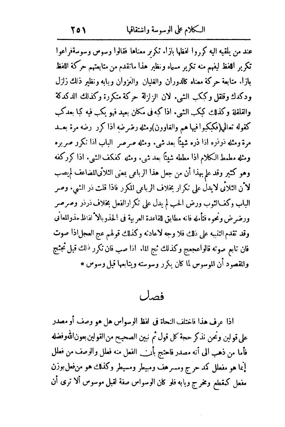 عند من يلقيه إليه كرروا لفظها بإزاء تكرير معناها فقالوا وسوس وسوسة فراعوا تكرير اللفظ ليفهم منه تكرير مسماه ونظير هذا ما تقدم من متابعتهم حركة اللفظ بإزاء متابعة حركة معناه كالدوران والغليان والنزوان وبابه ونظير ذلك زلزل ودكدك وقلقل وكبكب الشيء لأن الزلزلة حركة متكررة وكذلك الدكدكة والقلقلة وكذلك كبكب الشيء إذا كبه في مكان بعيد فهو يكب فيه كبا بعد كب كقوله تعالى: {فَكُبْكِبُوا فِيهَا هُمْ وَالْغَاوُونَ} ومثله رضرضة إذا كرر رضه مرة بعد مرة ومثله ذرذره إذا ذره شيئا بعد شيء ومثله صرصر الباب إذا تكرر صريره ومثله مطمط الكلام إذا مطه شيئا بعد شيء ومثله كفكف الشيء إذا كرر كفه وهو كثير وقد علم بهذا أن من جعل هذا الرباعي بمعنى الثلاثي المضاعف لم يصب لأن الثلاثي لا يدل على تكرار بخلاف الرباعي المكرر فإذا قلت ذر الشيء وصر الباب وكف الثوب ورض الحب لم يدل على تكرار الفعل بخلاف ذرذر وصرصر ورضرض ونحوه فتأمله فإنه مطابق للقاعدة العربية في الحذو بالألفاظ حذو المعاني وقد تقدم التنبيه على ذلك فلا وجه لإعادته وكذلك قولهم عج العجل إذا صوت فإن تابع صوته قالوا عجعج وكذلك ثج الماء إذا صب فإن تكرر ذلك قيل ثجثج والمقصود أن الموسوس لما كان يكرر وسوسته ويتابعها قبل وسوس.