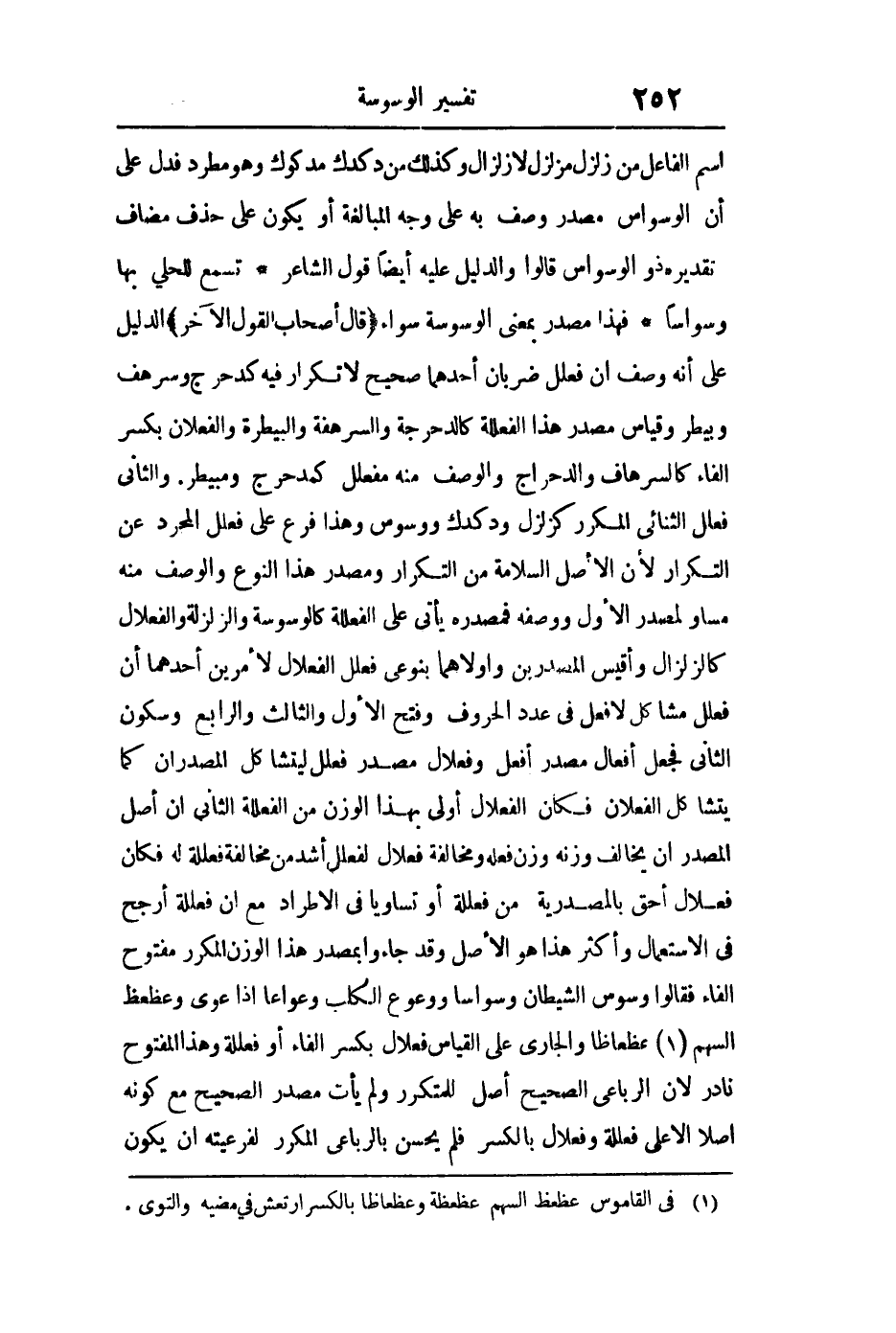 فهذا مصدر بمعنى الوسوسة سواء قال أصحاب الرأي الآخر: الدليل على أنه وصف أن فعلل ضربان أحدهما: صحيح لا تكرار فيه كدحرج وسرهف بيطر وقياس مصدر هذه الفعللة كالدحرجة والسرهفة والبيطرة والفعلان بكسر الفاء كالسرهاف والدحراج والوصف منه مفعلل كمدحرج ومبيطر والثاني: فعلل الثنائي المكرر كزلزل ودكدك ووسوس وهذا فرع على فعلل المجرد عن التكرار لأن الأصل السلامة من التكرار ومصدر هذا النوع والوصف منه مساو لمصدر الأول ووصفه فمصدره يأتي على الفعللة كالوسوسة والزلزلة والفعلال كالزلزال وأقيس المصدرين وأولاهما بنوعي فعلل الفعلان لأمرين أحدهما أن فعلل مشاكل لأفعل في عدد الحروف وفتح الأول والثالث والرابع: وسكون الثاني فجعل أفعال مصدر أفعل وفعلال مصدر فعلل ليتشاكل المصدران كما يتشاكل الفعلان فكان الفعلان أولى بهذا الوزن من الفعللة الثاني: أن أصل المصدر أن يخالف وزنه وزن فعله ومخالفة فعلال لفعلل أشد من مخالفة فعللة له فكان فعلال أحق بالمصدرية من فعللة أو تساويا في الاطراد من أن فعللة أرجع في الاستعمال وأكثر هذا هو الأصل وقد جاءوا بمصدر هذا الوزن المكرر مفتوح الفاء فقالوا وسوس الشيطان وسواسا ووعوع الكلب وعواعا إذا عوى وعظعظ السهم عظعاظا والجاري على القياس فعلال بكسر الفاء أو فعللة وهذا المفتوح نادر لأن الرباعي الصحيح أصل للمتكرر ولم يأت مصدر الصحيح مع كونه أصلا إلا على فعللة وفعلال بالكسر فلم يحسن بالرباعي المكرر لفرعيته أن يكون