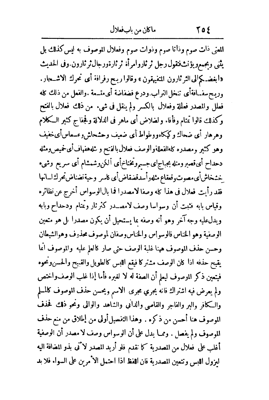 المعنى ذات صوم وذاتا صوم وذوات صوم وفعلال الموصوف به ليس كذلك بل يثنى ويجمع ويؤنث فتقول رجل ثرثار وامرأة ثرثارة ورجال ثرثارون وفي الحديث "أبغضكم إلي الثرثارون المتفيهقون " حسن وقالوا ريح رفرافة أي تحرك الأشجار وريح سفسافة أي تنخل التراب ودرع فضفاضة أي متسعة والفعل من ذلك كله فعلل والمصدر فعللة وفعلال بالكسر ولم ينقل في شيء من ذلك فعلال بالفتح وكذلك قالوا تمتام وفأفاء ولضلاض أي ماهر في الدلالة وفجفاج كثر الكلام وهرهار أي ضحاك وكهكاه ووطواط أي ضعيف وحشحاش وعسعاس أي خفيف وهو كثير ومصدره كله الفعللة والوصف فعلال بالفتح ومثله هفهاف أي خميص ومثله دحداح أي قصير ومثله بجباج أي جسيم وتختاج أي ألكن شمشام أي سريع وشيء خشخاش أي مصوت وقعقاع مثله وأسد فضفاض أي كاسر وحية نضناض تحرك لسانها فقد رأيت فعلال في هذا كله وصفا لا مصدرا فما بال الوسواس أخرج عن نظائره وقياس بابه فثبت أن وسواسا وصف لا مصدر كثرثار وتمتام ودحداح وبابه ويدل عليه وجه آخر وهو أنه وصفه بما يستحيل أن يكون مصدرا بل هو متعين الوصفية وهو الخناس فالوسواس والخناس وصفان لموصوف محذوف وهو الشيطان وحسن حذف الموصوف هاهنا غلبة الوصف حتى صار كالعلم عليه والموصوف إنما يقبح حذفه إذا كان الوصف مشتركا فيقع اللبس كالطويل والقبيح والحسن ونحوه فيتعين ذكر الموصوف ليعلم أن الصفة له لا لغيره فأما إذا غلب الوصف واختص ولم يعرض فيه اشتراك فإنه يجري مجرى الاسم ويحسن حذف الموصوف كالمسلم والكافر والبر والفاجر والقاصي والداني والشاهد والوالي ونحو ذلك فحذف الموصوف هنا أحسن من ذكره وهذا التفصيل أولى من إطلاق من منع حذف الموصوف ولم يفصل ومما يدل على أن الوسواس وصف لا مصدر أن الوصفية أغلب على فعلال من المصدرية كما تقدم فلو أريد المصدر لأتي بذو المضافة إليه ليزول اللبس وتتعين المصدرية فإن اللفظ إذا احتمل الأمرين على السواء فلا بد