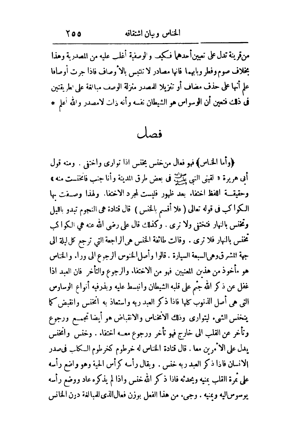وأما الخناس: فهو فعال من خنس يخنس إذا توارى واختفى ومنه قول أبي هريرة: "لقيني النبي صلى الله عليه وسلم في بعض طرق المدينة وأنا جنب فانخنست منه: وحقيقة اللفظ اختفاء بعد ظهور فليست لمجرد الاختفاء ولهذا وصفت بها الكواكب في قوله تعالى: {فَلا أُقْسِمُ بِالْخُنَّسِ} قال قتادة: "هي النجوم تبدو بالليل وتخنس بالنهار فتختفي ولا ترى" وكذلك قال علي رضي الله عنه: "هي الكواكب تخنس بالنهار فلا ترى" وقالت طائفة: الخنس هي الراجعة التي ترجع كل ليلة إلى جهة المشرق وهي السبعة السيارة" قالوا: وأصل الخنوس الرجوع إلى وراء" والخناس مأخوذ من هذين المعنيين فهو من الاختفاء والرجوع والتأخر فإن العبد إذا غفل عن ذكر الله جثم على قلبه الشيطان وانبسط عليه وبذر فيه أنواع الوساوس التي هي أصل الذنوب كلها فإذا ذكر العبد ربه واستعاذ به انخنس وانقبض كما ينخنس الشيء ليتوارى وذلك الإنخناس والانقباض هو أيضا تجمع ورجوع وتأخر عن القلب إلى خارج فهو تأخر ورجوع معه اختفاء وخنس وانخنس يدل على الأمرين معا قال قتادة الخناس له خرطوم كخرطوم الكلب في صدر الإنسان فإذا ذكر العبد ربه خنس ويقال رأسه كرأس الحية وهو واضع رأسه على ثمرة القلب يمنيه ويحدثه فإذا ذكر الله تعالى خنس وإذا لم يذكره عاد ووضع رأسه يوسوس إليه ويمنيه وجيء من هذا الفعل بوزن فعال الذي للمبالغة دون الخانس