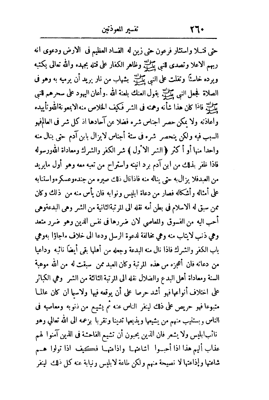 حتى قتلا واستثار فرعون حتى زين له الفساد العظيم في الأرض ودعوى أنه ربهم الأعلى وتصدى للنبي صلى الله عليه وسلم وظاهر الكفار على قتله بجهده والله تعالى يكبته ويرده خاسئا وتفلت على النبي صلى الله عليه وسلم بشهاب من نار يريد أن يرميه به وهو في الصلاة فجعل النبي صلى الله عليه وسلم يقول ألعنك بلعنة الله وأعان اليهود على سحرهم للنبي صلى الله عليه وسلم فإذا كان هذا شأنه وهمته في الشر فكيف الخلاص منه إلا بمعونة الله وتأييده وإعاذته ولا يمكن حصر أجناس شره فضلا عن آحادها إذ كل شر في العالم فهو السبب فيه ويكن ينحصر شره في ستة أجناس لا يزال بابن آدم حتى ينال منه واحدا منها أو أكثر الشر الأول: شر الكفر والشرك ومعاداة الله ورسوله فإذا ظفر بذلك من ابن آدم برد أنينه واستراح من تعبه معه وهو أول ما يريد من العبد فلا يزال به حتى يناله منه فإذا نال ذلك صيره من جنده وعسكره واستنابه على أمثاله وأشكاله فصار من دعاة إبليس ونوابه فإذا يئس منه من ذلك وكان ممن سبق له الإسلام في بطن أمه نقله إلى المرتبة الثانية من الشر: وهي البدعة وهي أحب إليه من الفسوق والمعاصي لأن ضررها في نفس الدين وهو ضرر متعد وهي ذنب لا يتاب منه وهي مخالفة لدعوة الرسل ودعا إلى خلاف ما جاءوا به وهي باب الكفر والشرك فإذا نال منه البدعة وجعله من أهلها بقي أيضا نائبه وداعيا من دعائه فإن أعجزه من هذه المرتبة وكان العبد ممن سبقت له من الله موهبة السنة ومعاداة أهل البدع والضلال نقله إلى المرتبة الثالثة من الشر: وهي الكبائر على اختلاف أنواعها فهو أشد حرصا على أن يوقعه فيها ولا سيما إن كان عالما متبوعا فهو حريص على ذلك لينفر الناس عنه ثم يشيع من ذنوبه ومعاصيه في الناس ويستنيب منهم من يشيعها ويذيعها تدينا وتقربا بزعمه إلى الله تعالى وهو نائب إبليس ولا يشعر فإن الذين يحبون أن تشيع الفاحشة في الذين آمنوا لهم عذاب أليم هذا إذا أحبوا إشاعتها وإذاعتها فكيف إذا تولوا هم إشاعتها وإذاعتها لا نصيحة منهم ولكن طاعة لإبليس ونيابة عنه كل ذلك لينفر