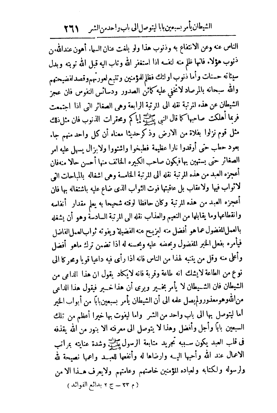 الناس عنه وعن الانتفاع به وذنوب هذا ولو بلغت عنان السماء أهون عند الله من ذنوب هؤلاء فإنها ظلم منه لنفسه إذا استغفر الله وتاب إليه قبل الله توبته وبدل سيئاته حسنات وأما ذنوب أولئك فظلم للمؤمنين وتتبع لعورتهم وقصد لفضيحتهم والله سبحانه بالمرصاد لا تخفى عليه كمائن الصدور ودسائس النفوس فإن عجز الشيطان عن هذه المرتبة نقله إلى المرتبة الرابعة وهي الصغائر التي إذا اجتمعت فربما أهلكت صاحبها كما قال النبي صلى الله عليه وسلم "إياكم ومحقرات الذنوب فإن مثل ذلك مثل قوم نزلوا بفلاة من الأرض " صحيح وذكر حديثا معناه أن كل واحد منهم جاء بعود حطب حتى أوقدوا نارا عظيمة فطبخوا واشتووا ولا يزال يسهل عليه أمر الصغائر حتى يستهين بها فيكون صاحب الكبيرة الخائف منها أحسن حالا منه فإن أعجزه العبد من هذه المرتبة نقله إلى المرتبة الخامسة: وهي إشغاله بالمباحات التي لا ثواب فيها ولا عقاب بل عاقبتها فوت الثواب الذي ضاع عليه باشتغاله بها فإن أعجزه العبد من هذه المرتبة وكان حافظا لوقته شحيحا به يعلم مقدار أنفاسه وانقطاعها وما يقابلها من النعيم والعذاب نقله إلى المرتبة السادسة: وهو أن يشغله بالعمل المفضول عما هو أفضل منه ليزيح عنه الفضيلة ويفوته ثواب العمل الفاضل فيأمره بفعل الخير المفضول ويحضه عليه ويحسنه له إذا تضمن ترك ما هو أفضل وأعلى منه وقل من يتنبه لهذا من الناس فإنه إذا رأى فيه داعيا قويا ومحركا إلى نوع من الطاعة لا يشك أنه طاعة وقربة فإنه لا يكاد يقول إن هذا الداعي من الشيطان فإن الشيطان لا يأمر بخير ويرى أن هذا خير فيقول هذا الداعي من الله وهو معذور ولم يصل علمه إلى أن الشيطان يأمر بسبعين بابا من أبواب الخير إما ليتوصل بها إلى باب واحد من الشر وإما ليفوت بها خيرا أعظم من تلك السبعين بابا وأجل وأفضل وهذا لا يتوصل إلى معرفته إلا بنور من الله يقذفه في قلب العبد يكون سببه تجريد متابعة الرسول صلى الله عليه وسلم وشدة عنايته بمراتب الأعمال عند الله وأحبها إليه وأرضاها له وأنفعها للعبد وأعمها نصيحة لله تعالى ولرسوله ولكتابه ولعباده المؤمنين خاصتهم وعامتهم ولا يعرف هذا إلا من