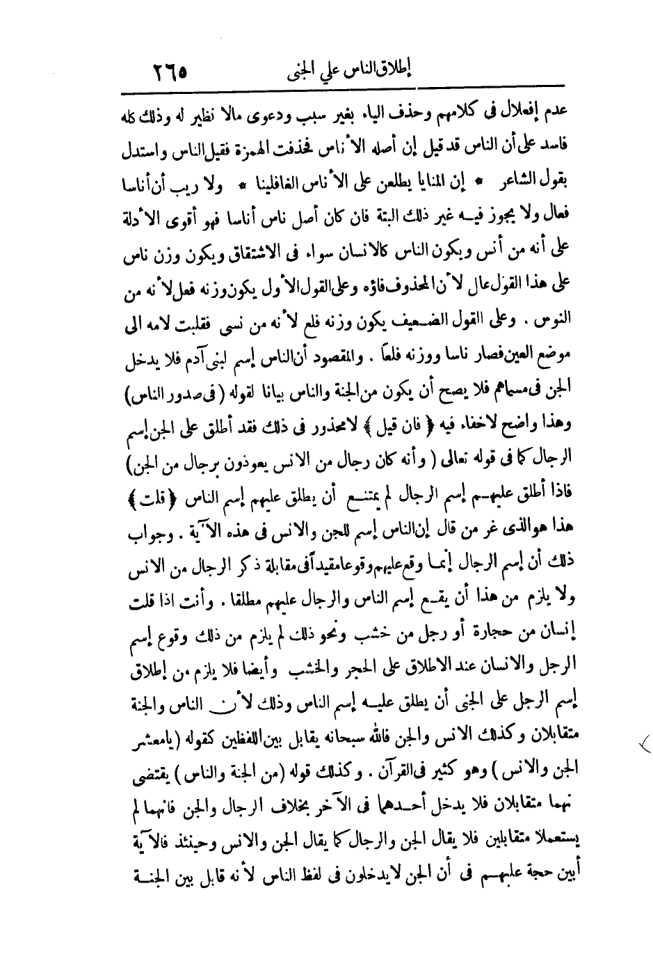 ولا ريب أن أناسا فعال ولا يجوز فيه غير ذلك البتة فإن كان أصل ناس أناسا فهو أقوى الأدلة على أنه من أنس ويكون الناس كالإنسان سواء في الاشتقاق ويكون وزن ناس على هذا القول عال لأن المحذوف فاؤه وعلي القول الأول يكون وزنه فعل لأنه من النوس وعلى القول الضعيف يكون وزنه فلع لأنه من نسي فقلبت لامه إلى موضع العين فصار ناسا ووزنه فلعا والمقصود أن الناس إسم لبني آدم فلا يدخل الجن في مسماهم فلا يصح أن يكون من الجنة والناس بيانا لقوله: {فِي صُدُورِ النَّاسِ} وهذا واضح لا خفاء فيه فإن قيل لا محذور في ذلك فقد أطلق على الجن اسم الرجال كما في قوله تعالى: {وَأَنَّهُ كَانَ رِجَالٌ مِنَ الإنْسِ يَعُوذُونَ بِرِجَالٍ مِنَ الْجِنِّ} فإذا أطلق عليهم اسم الرجال لم يمتنع أن يطلق عليهم اسم الناس قلت: هذا هو الذي غر من قال إن الناس اسم للجن والإنس في هذه الآية وجواب ذلك أن اسم الرجال إنما وقع عليهم وقوعا مقيدا في مقابلة ذكر الرجال من الإنس ولا يلزم من هذا أن يقع اسم الناس والرجال عليهم مطلقا وأنت إذا قلت إنسان من حجارة أو رجل من خشب ونحو ذلك لم يلزم من ذلك وقوع اسم الرجل والإنسان عند الإطلاق على الحجر والخشب وأيضا فلا يلزم من إطلاق اسم الرجل على الجني أن يطلق عليه اسم الناس وذلك لأن الناس والجنة متقابلان وكذلك والإنس والجن فالله تعالى يقابل بين اللفظين كقوله: {يَا مَعْشَرَ الْجِنِّ وَالأِنْسِ} وهو كثير في القرآن وكذلك قوله: {مِنَ الْجِنَّةِ وَالنَّاسِ} يقتضي أنهما متقابلان فلا يدخل أحدهما في الآخر بخلاف الرجال والجن فإنهما لم يستعملا متقابلين فلا يقال الجن والرجال كما يقال الجن والإنس وحينئذ فالآية أبين حجة عليهم في أن الجن لا يدخلون في لفظ الناس لأنه قابل بين الجنة