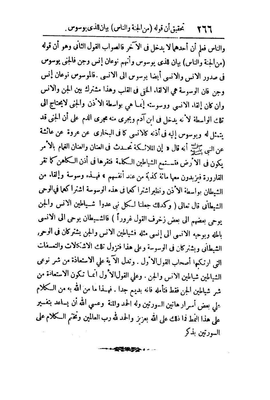 والناس فعلم أن أحدهما لا يدخل في الآخر فالصواب القول الثاني وهو أن قوله: {مِنَ الْجِنَّةِ وَالنَّاسِ} بيان للذي يوسوس وأنهما نوعان إنس وجن فالجني يوسوس في صدور الإنس والإنسي أيضا يوسوس إلى الإنسي فالموسوس نوعان إنس وجن فإن الوسوسة هي الإلقاء الخفي في القلب وهذا مشترك بين الجن والإنس وإن كان إلقاء الإنسي ووسوسته إنما هي بواسطة الأذن والجني لا يحتاج إلى تلك الواسطة لأنه يدخل في ابن آدم ويجري منه مجرى الدم على أن الجني قد يتمثل له ويوسوس إليه في أذنه كالإنسي كما في البخاري عن عروة عن عائشة عن النبي صلى الله عليه وسلم أنه قال: "إن الملائكة تحدث في العنان والعنان الغمام بالأمر يكون في الأرض فتسمع الشياطين الكلمة فتقرها في أذن الكاهن كما تقر القارورة فيزيدون معها مائة كذبة من عند أنفسهم " رواه البخاري والترمذي فهذه وسوسة وإلقاء من الشيطان بواسطة الأذن ونظير اشتراكهما في هذه الوسوسة اشتراكهما في الوحي الشيطاني قال تعالى: {وَكَذَلِكَ جَعَلْنَا لِكُلِّ نَبِيٍّ عَدُوّاً شَيَاطِينَ الإنْسِ وَالْجِنِّ يُوحِي بَعْضُهُمْ إِلَى بَعْضٍ زُخْرُفَ الْقَوْلِ غُرُوراً} فالشيطان يوحي إلى الإنسي باطله ويوحيه الإنسي إلى إنسي مثله فشياطين الإنس والجن يشتركان في الوحي الشيطاني ويشتركان في الوسوسة وعلى هذا فتزول تلك الإشكالات والتعسفات التي ارتكبها أصحاب القول الأول وتدل الآية على الاستعاذة من شر نوعي الشياطين شياطين الإنس والجن وعلى القول الأول إنما تكون الاستعاذة من شر شياطين الجن فقط فتأمله فإنه بديع جدا فهذا ما من الله به من الكلام على بعض أسرار هاتين السورتين وله الحمد والمنة وعسى الله أن يساعد بتفسير على هذا النمط فما ذلك على الله بعزيز والحمد لله رب العالمين ونختم الكلام على السورتين بذكر.