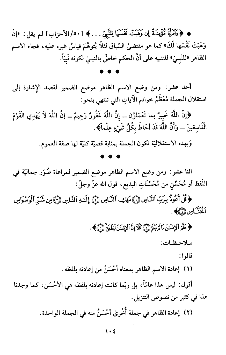 اثنا عشر: ومن وضع الاسم الظاهر موضع الضمير لمراعاة صُوَر جماليّة في اللّفظ أو مُحَسِّنٍ من مُحَسِّنَاتِ البديع، قول الله عزّ وجلّ: