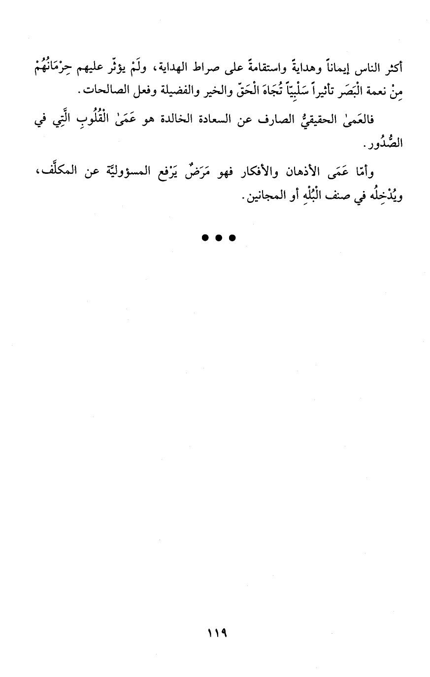 وأمّا عَمَى الأذهان والأفكار فهو مَرَضٌ يَرْفع المسؤوليَّة عن المكلَّف، ويُدْخِلُه في صنف الْبُلْهِ أو المجانين.