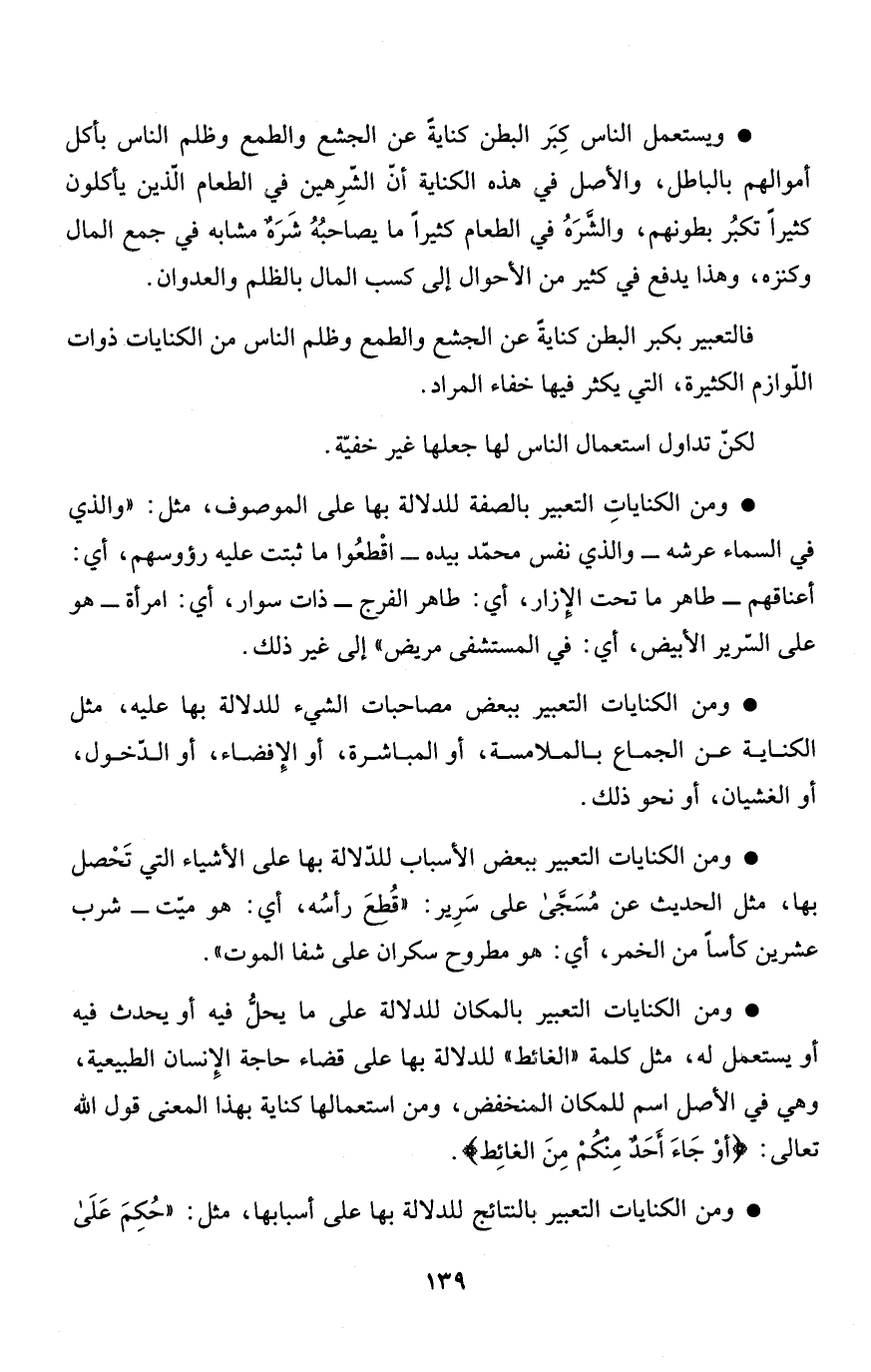 * ومن الكناياتِ التعبير بالصفة للدلالة بها على الموصوف، مثل: "والذي في السماء عرشه - والذي نفس محمّد بيده - اقْطعُوا ما ثبتت عليه رؤوسهم، أي: أعناقهم - طاهر ما تحت الإزار، أي: طاهر الفرج - ذات سوار، أي: امرأة - هو على السّرير الأبيض، أي: في المستشفى مريض" إلى غير ذلك.