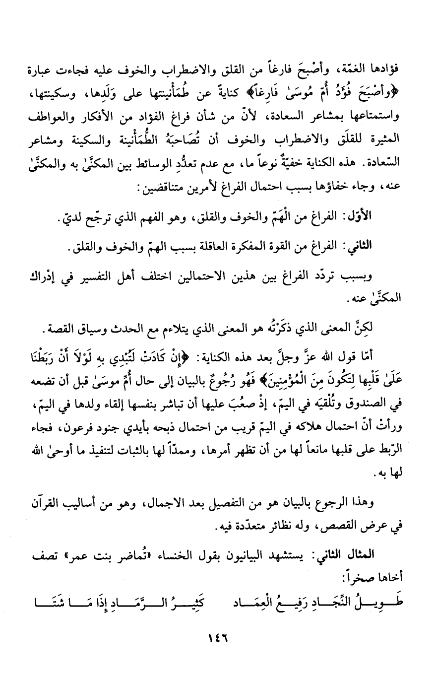 فؤادها الغمّة، وأصْبحَ فارغاً من القلق والاضطراب والخوف عليه فجاءت عبارة {وَأَصْبَحَ فُؤَادُ أُمِّ موسى فَارِغاً} كنايةً عن طُمَأْنينتها على وَلَدِها، وسكينتها، واستمتاعها بمشاعر السعادة، لأنّ من شأن فراغ الفؤاد من الأفكار والعواطف المثيرة للقلَق والاضطراب والخوف أن تُصَاحبَهُ الطُّمَأْنينة والسكينة ومشاعر السّعادة. هذه الكناية خفيّةٌ نوعاً ما، مع عدم تعدُّدِ الوسائط بين المكنَّى به والمكنَّى عنه، وجاء خفاؤها بسبب احتمال الفراغ لأمرين متناقضين: