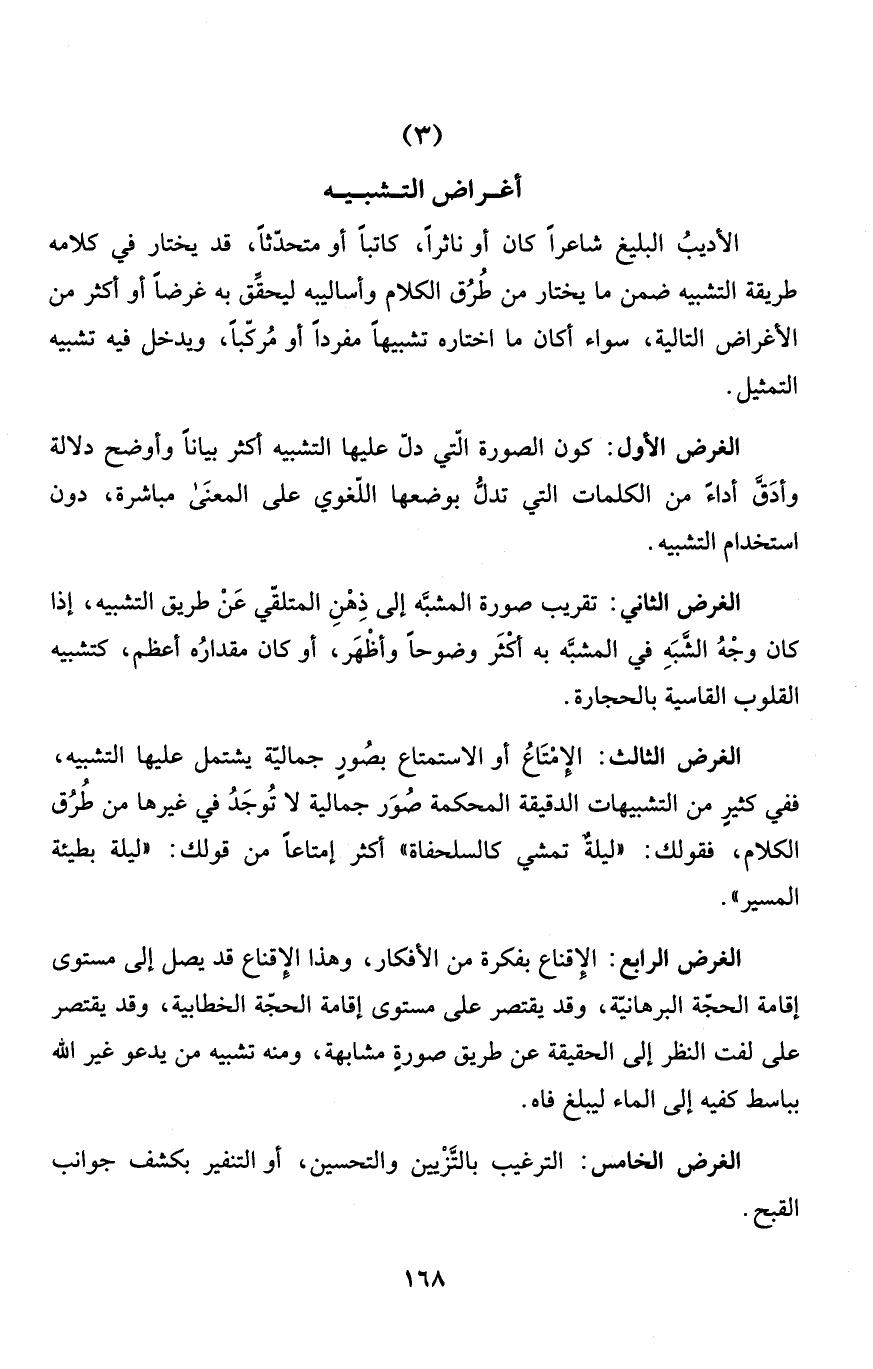 الغرض الثالث: الإِمْتَاعُ أو الاستمتاع بصُورٍ جماليّة يشتمل عليها التشبيه، ففي كثيرٍ من التشبيهات الدقيقة المحكمة صُوَر جمالية لا تُوجَدُ في غيرها من طُرُق الكلام، فقولك: "ليلةٌ تمشي كالسلحفاة" أكثر إمتاعاً من قولك: "ليلة بطيئة المسير".