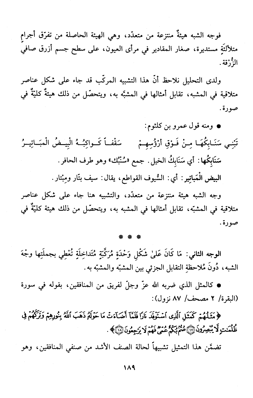 الوجه الثاني: مَا كَانَ عَلى شَكْلِ وَحْدَةٍ مُرَكَّبَةٍ مُتَداخِلَةٍ تُعْطِي بجملَتِها وجْهَ الشبه، دُونَ مُلاحظةِ التقابل الجزئي بين المشبّه والمشبّه به.
