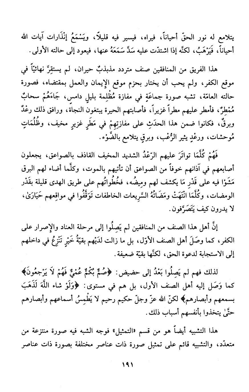 هذا الفريق من المنافقين صنف متردد مذبذبٌ حيران، لم يستقِرَّ نهائيّاً في موقع الكفر، ولم يحب أن يختار بحزم موقع الإِيمان والعمل بمقتضاه، فصورة حالته العامّة، تشبه صورة جماعَةٍ في مفازة مُظْلِمة بليلٍ دامسٍ، جَاءَهُمْ سحابٌ مُمْطِرٌ، فأمطر عليهم مطراً غزيراً، فأصابتهم الحيرة يبتغون النجاة، ورافق ذلك رعْدٌ وبرقٌ، فكانوا ضمن هذا الحدَثِ على مفازتِهِمْ في مَطَرٍ غزيرٍ مخيفٍ، وظُلُمَاتٍ مُوحشات، ورعْدٍ يثير الرُّعْب، وبرقٍ يتلامع بالضَّوْء.