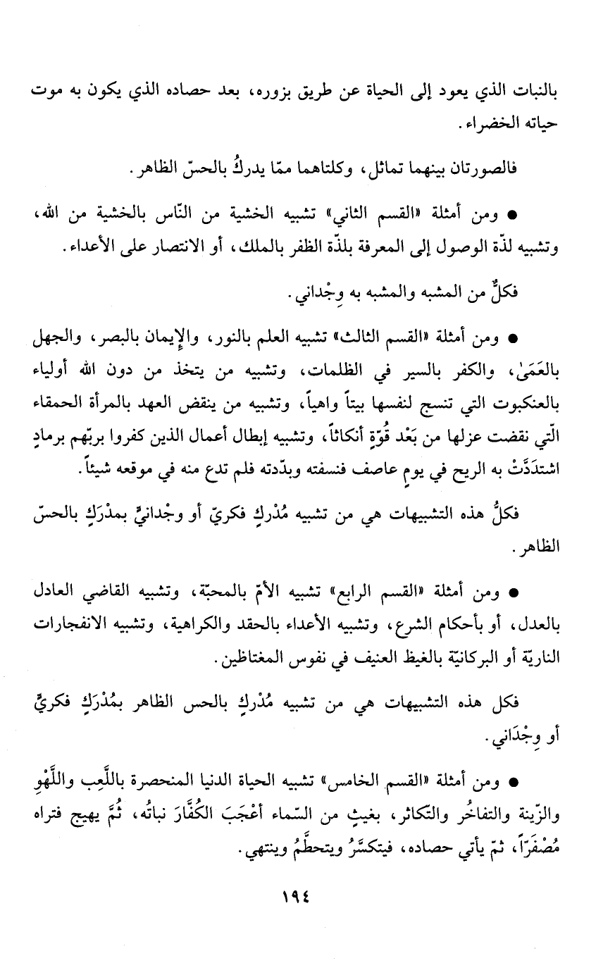 * ومن أمثلة "القسم الثاني" تشبيه الخشية من النّاس بالخشية من الله، وتشبيه لذّة الوصول إلى المعرفة بلذّة الظفر بالملك، أو الانتصار على الأعداء.