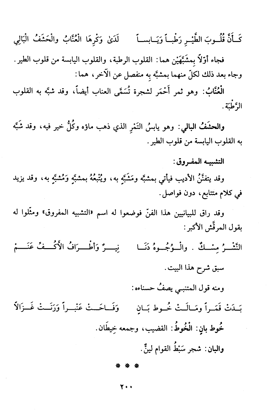 فجاء أوّلاً بِمشَبَّهَيْن هما: القلوب الرطبة، والقلوب اليابسة من قلوب الطير. وجاء بعد ذلك لكلّ منهما بمشبَّه بِه منفصل عن الآخر، هما: