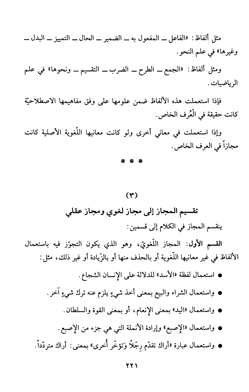 القسم الأول: المجاز اللّغويّ، وهو الذي يكون التجوّز فيه باستعمال الألفاظ في غير معانيها اللّغوية أو بالحذف منها أو بالزّيادة أو غير ذلك، مثل: