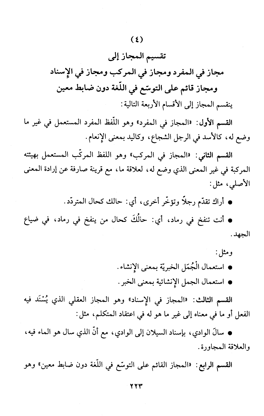 تقسيم المجاز إلى مجاز في المفرد ومجاز في المركب ومجاز في الإِسناد ومجاز قائم على التوسّع في اللّغة دون ضابط معين