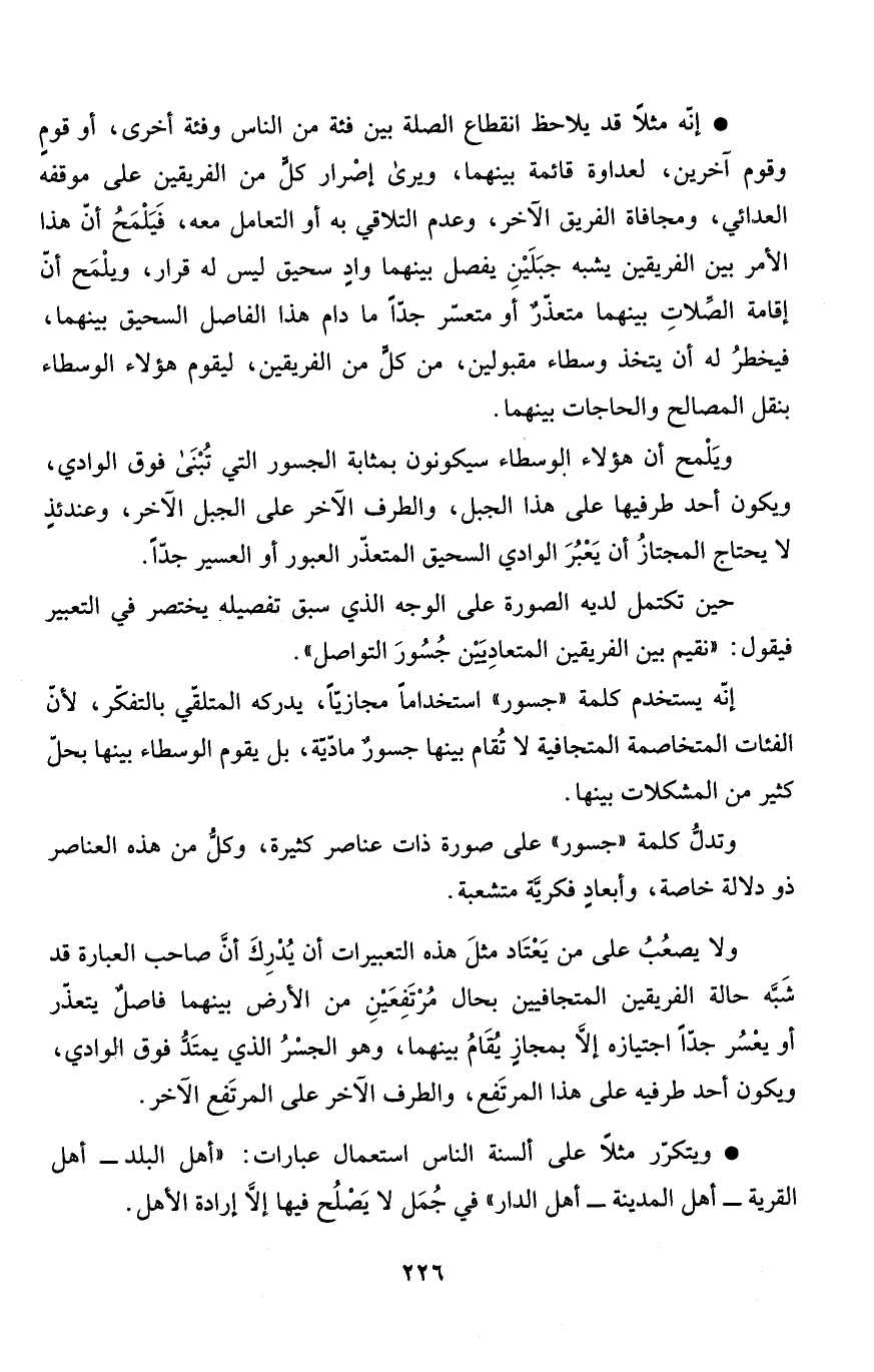 إنّه يستخدم كلمة "جسور" استخداماً مجازيّاً، يدركه المتلقّي بالتفكّر، لأنّ الفئات المتخاصمة المتجافية لا تُقام بينها جسورٌ مادّيّة، بل يقوم الوسطاء بينها بحلّ كثير من المشكلات بينها.