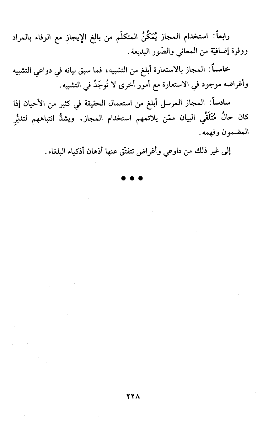 خامساً: المجاز بالاستعارة أبلغ من التشبيه، فما سبق بيانه في دواعي التشبيه وأغراضه موجود في الاستعارة مع أمور أخرى لا تُوجَدُ في التشبيه.