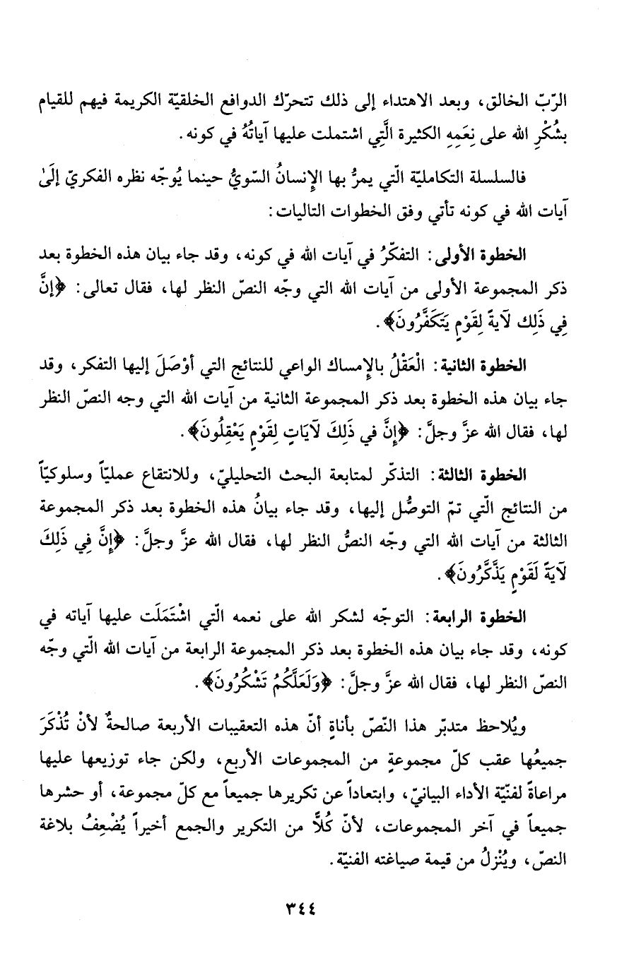 الخطوة الرابعة: التوجّه لشكر الله على نعمه الّتي اشْتَمَلَت عليها آياته في كونه، وقد جاء بيان هذه الخطوة بعد ذكر المجموعة الرابعة من آيات الله الّتي وجّه النصّ النظر لها، فقال الله عزَّ وجلَّ: {وَلَعَلَّكُمْ تَشْكُرُونَ} .